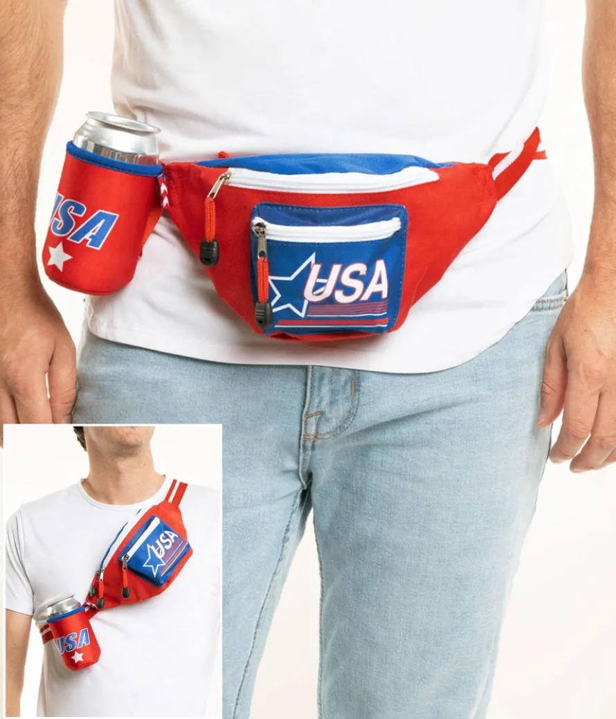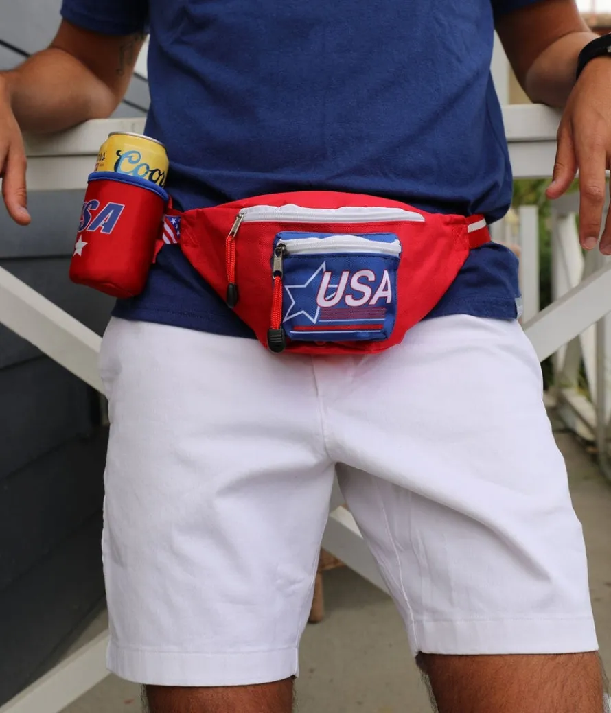 What could be more all-American than the ubiquitous fanny pack? Citizens of lesser nations may titter at this common-sense accessory, but they won’t be laughing when you’re the only one in the crowd who can find the keys to the minivan! This prime example is certain to get your patriotic juices flowing with its red, white, and blue colors, star motifs, and USA in bold lettering. The main pouch has three zippered compartments for convenience. Stash cash in one, ID in another, and keys in the third for fast, easy access. Just another day in the USA!