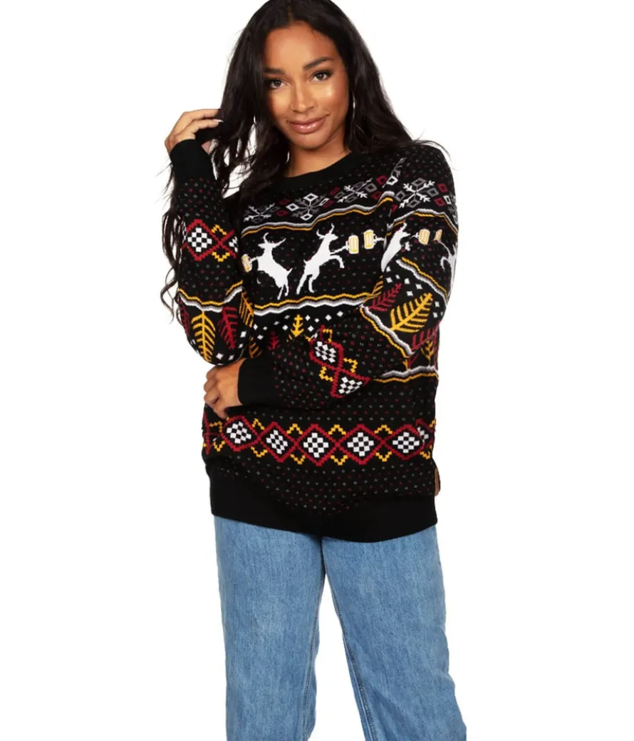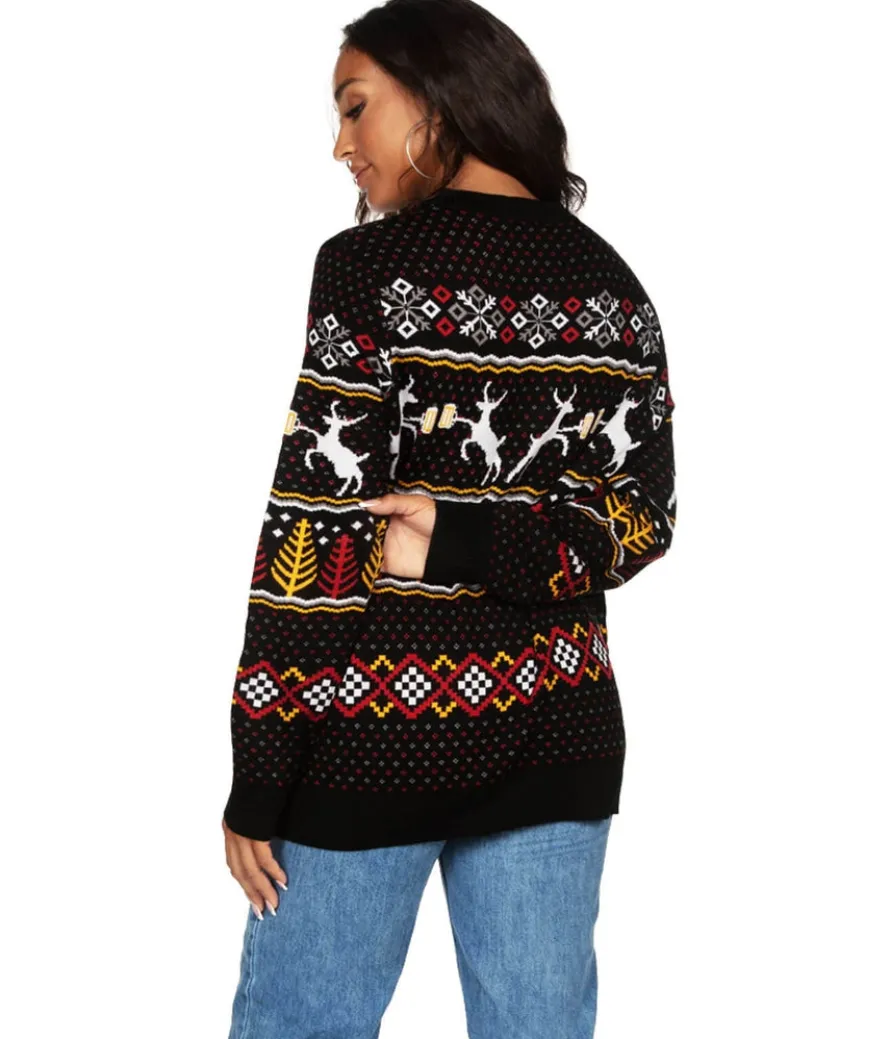 Care for a brew? Or possibly just a caribrew? Either way, we’ve got you set on all fronts in the Women’s Caribrew Oversized Christmas Sweater. This style-forward oversized fit features jolly holiday caribrew dancing about – which is honestly everything we want to be. We care for a brew pretty much daily.