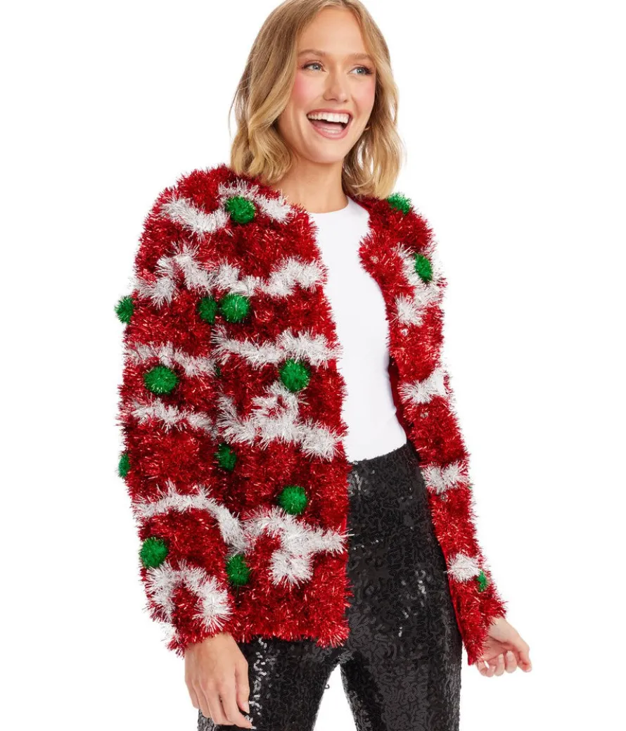 Razzle dazzle ‘em and deck yourself in red. Do the most this holiday season in the Women’s Decked in Red Christmas Cardigan Sweater, decked out with white strands and green bulbs on a bushy, festive red cardigan. It could not possibly get any more Christmas time than this.