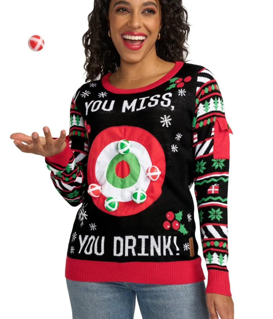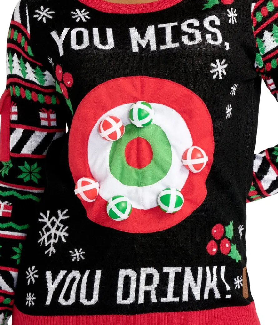 This women’s drinking game ugly christmas sweater isn’t just fun for the person wearing it, it’s fun for the whole party! It comes with six velcro balls that will stick to the sweater when thrown. It also comes with a rule card that will lay down the law of the Tipsy Elves Drinking Game. The target is a decent size but as the game goes on, it will become increasingly hard to hit and hopefully that means everyone is having a blast! Check out the back of the sweater for a reminder of the rules and remember to drink responsibly.