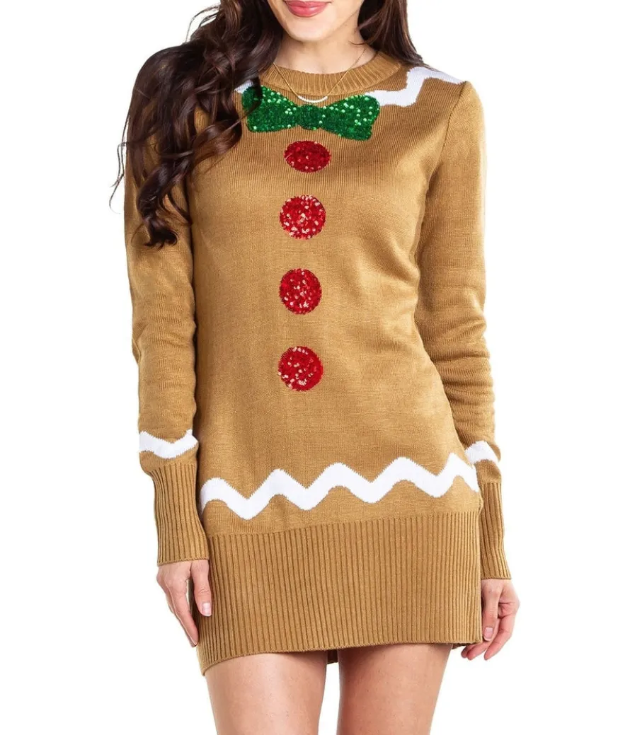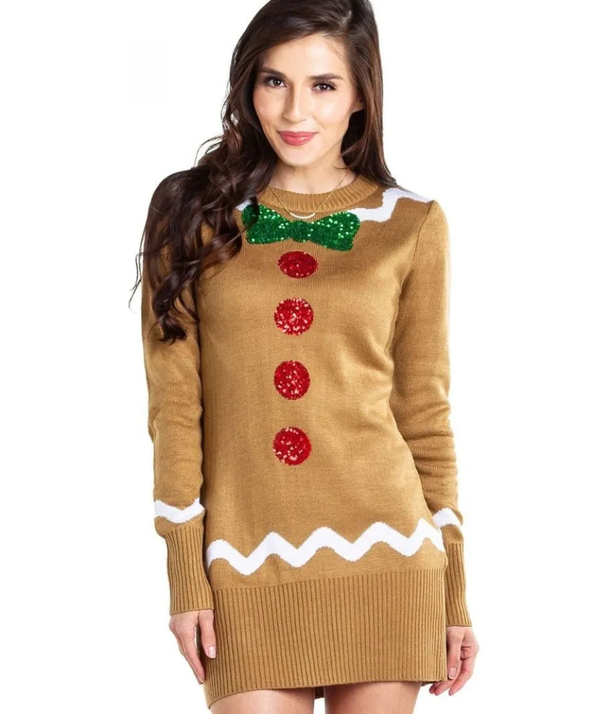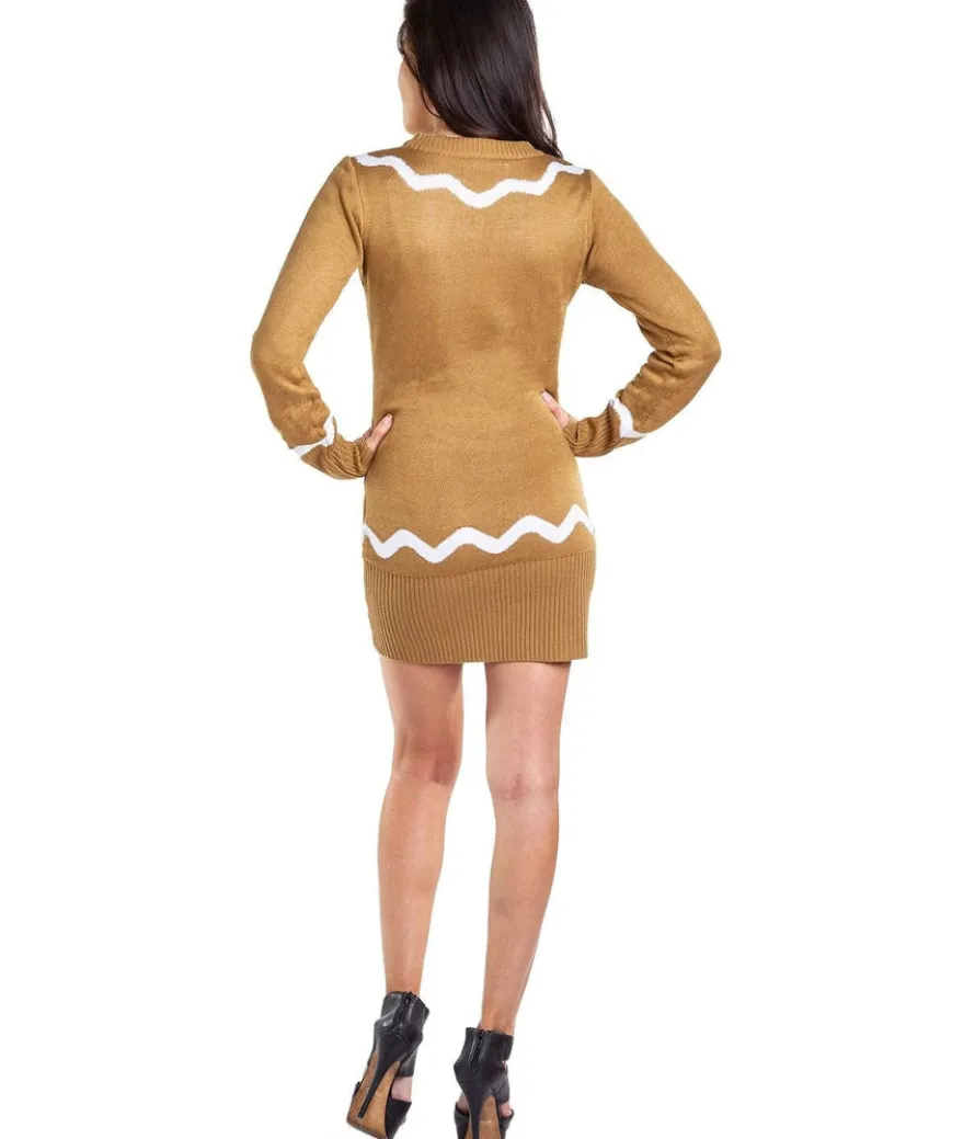Sweet and spicy. That’s the winning combination that makes our women’s gingerbread sweater dress a wardrobe favorite. The sequined decorations are just the icing on the cookie. You can wear this knit dress with our candy themed leggings and a bow in your hair to add even more sugar to the mix.