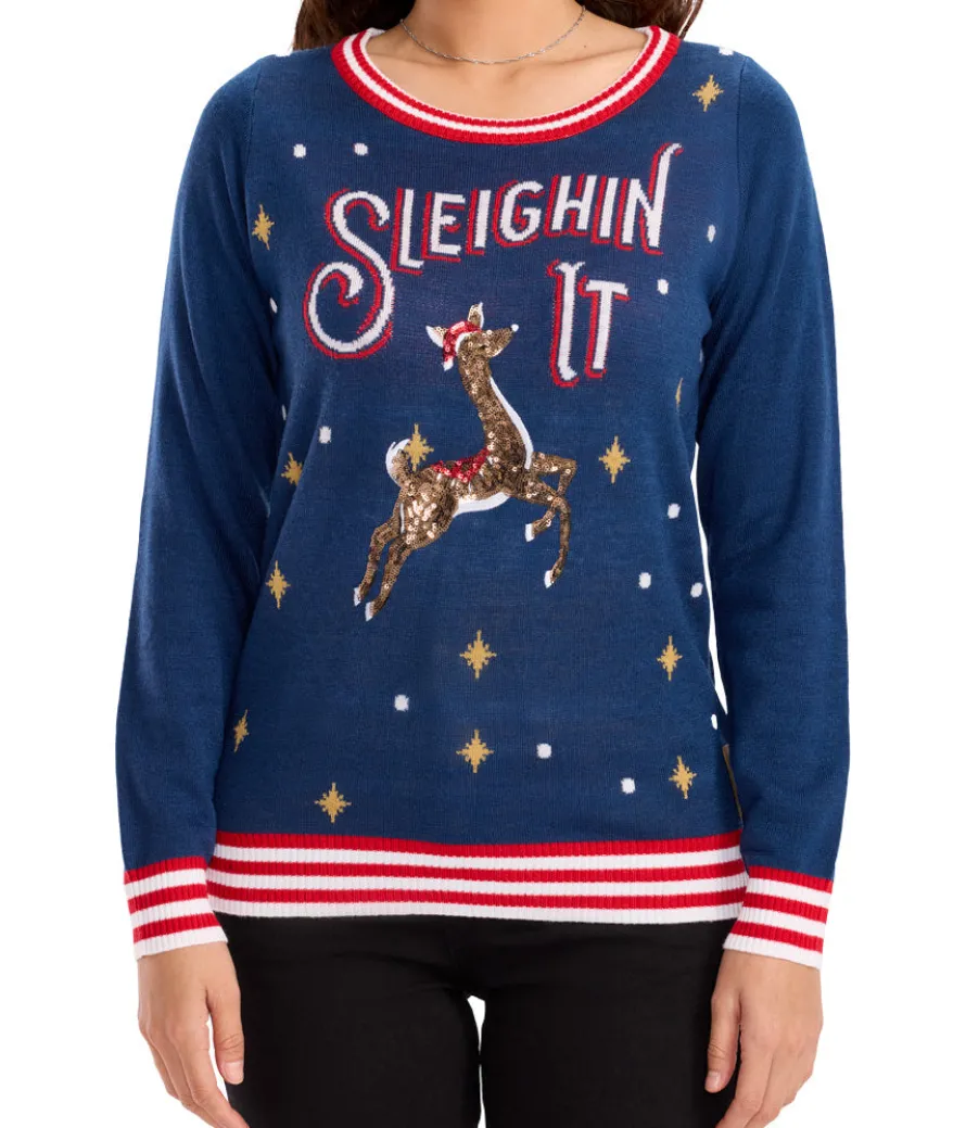 Turkey’s done, presents bought, office party hangover done. Girl, you are sleighin’ it, so say it loud and proud with this Women’s Sleighin’ It ugly Christmas sweater. Featuring a super chill crew neck and reindeer gal by your side, this one’s as classy as it is sassy. Take it for a spin Christmas shopping or gift it to your fellow queens who are also killing the holiday stress.
