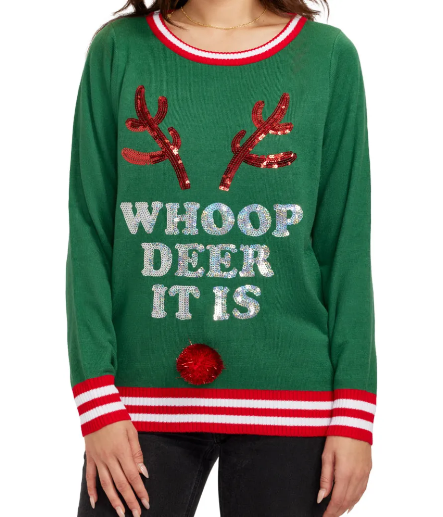Sometimes you make an oops it isn’t even worth attempting to fix. Once it’s done, just put it all out there. Sport your shameless nature with a holiday twist in the Women’s Whoop Deer it is Ugly Christmas Sweater! The cute pun and adorable holiday animal will distract them all from whatever mess you’ve made.