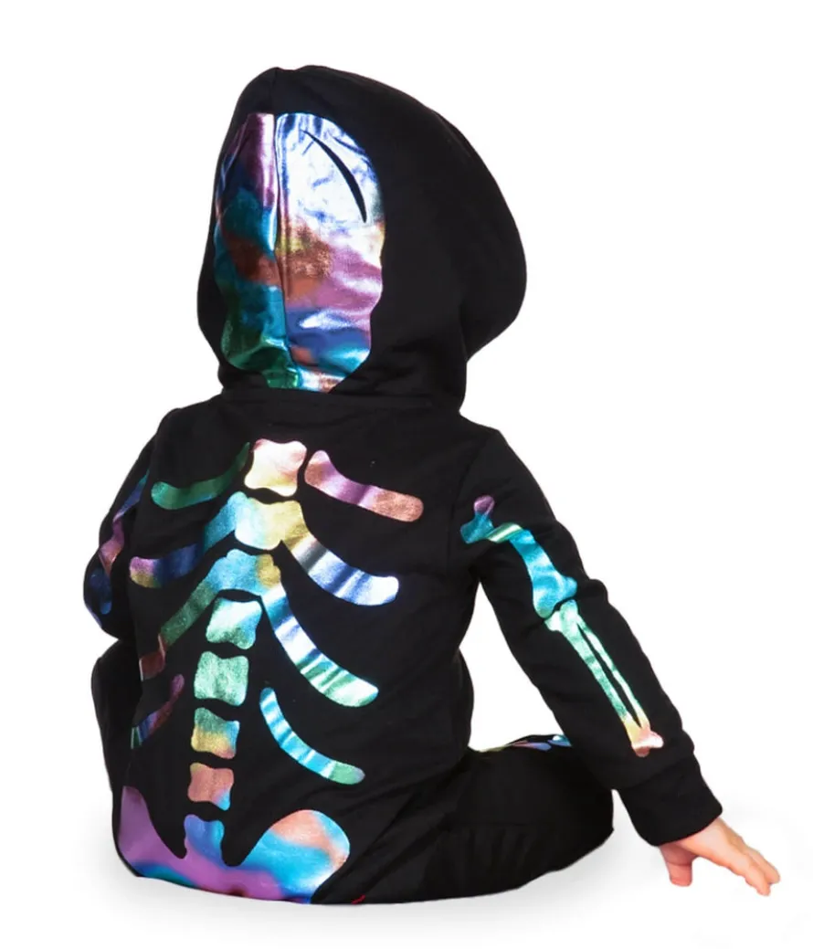 This Baby Boy’s Iridescent Skeleton Costume is just like the toddler’s, boy’s, and men’s versions, only much, much smaller. And really, isn’t that a perfect metaphor for your baby boy’s life at this stage? Everything is scaled way down. No stress. No worries. In some regards, he might actually be peaking at this very moment. Interesting. Apparently, it’s never too early for an existential crisis. Happy Halloween!