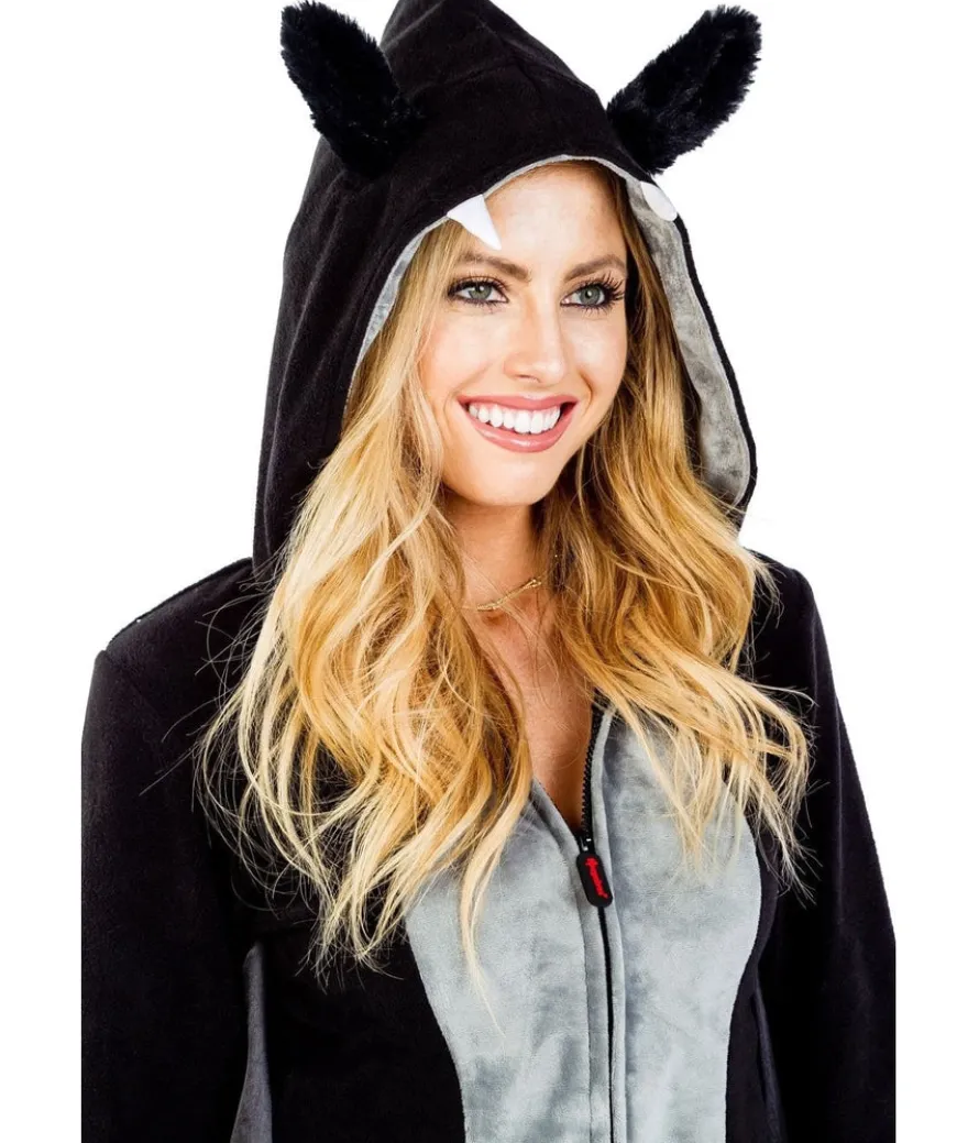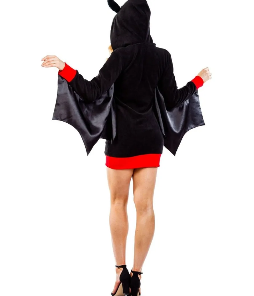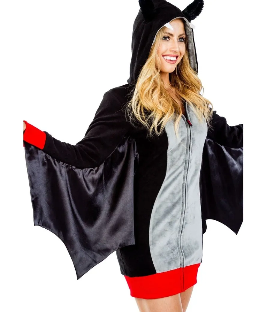 Did you ever dance with the devil in the pale moonlight? You certainly will be this Halloween thanks to our awesome bat girl costume. Nobody is blind to the beauty of this bat dress. Put this on and you’ll be turning heads instantly. Throw one shape on the dance floor and you’ve already spread your wings. They’re totally to scale and you’re in complete control. No knocking over the buffet every time you turn. Once you pull the hood up, you’ve also got your own pair of cute and fluffy ears. Let’s not forget those fearsome fangs either. You don’t need mascara when you’ve got those gnashers sitting over your eyes! This warm and fluffy dress is easier to get into than most Halloween costumes. Just whip down the zip and you’re done! No more bathroom nightmares. A red hem adds a dash of color. Now choose who to bite.