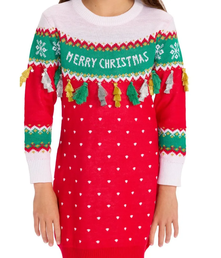 Add a little something special to her holiday wardrobe with the Girl’s Merry Christmas Tassel Sweater Dress! Deck her out in red, white and green adorned by adorable tassels across the front – because she deserves to be decor.