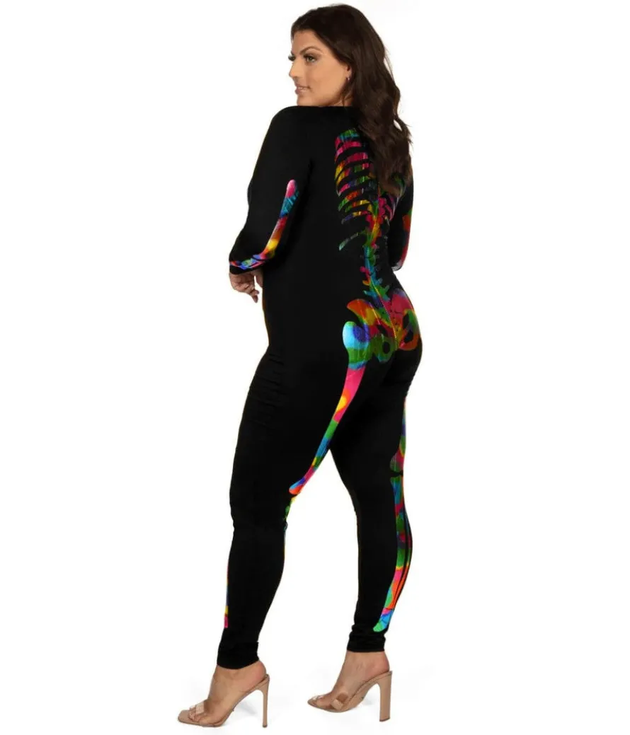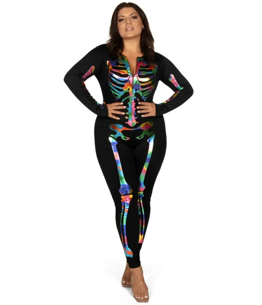 Unleash your inner skeleton with our Iridescent Skeleton Plus Size Bodysuit Costume! Perfect for Halloween, this sexy bodysuit will make you shine with its iridescent fabric. Bring some fun to the spooky season with this costume.