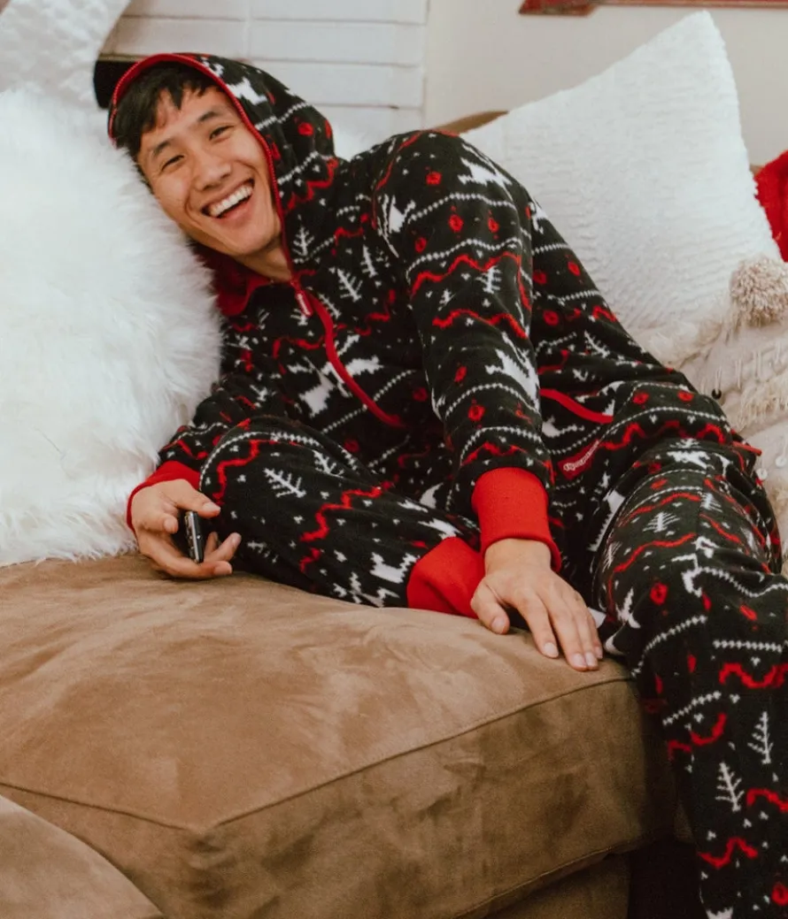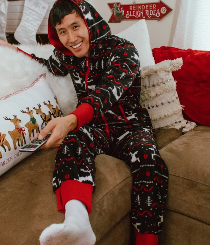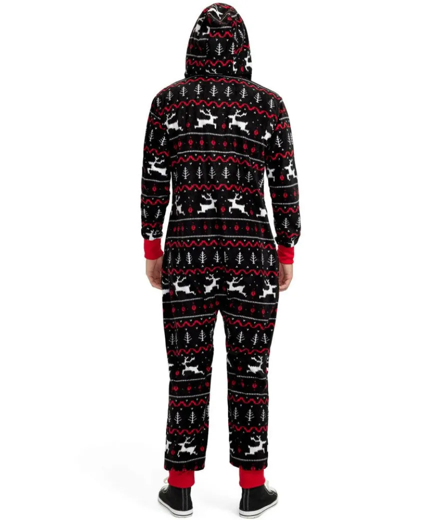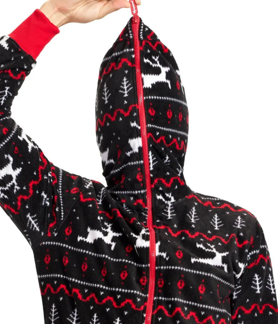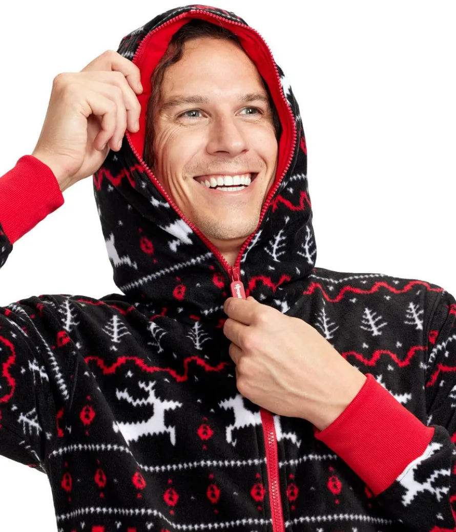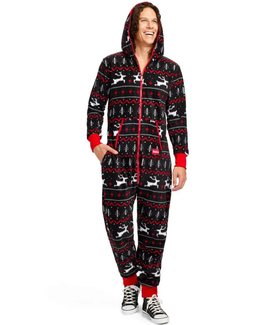 What’s black and red and caribou all over? You in our awesome reindeer onesie. Those little prancing deer are really putting the jump in jumpsuit. It makes us tired just watching them. If you get tired while wearing this outfit, we have good news. It’s perfectly acceptable to wear this piece to bed.