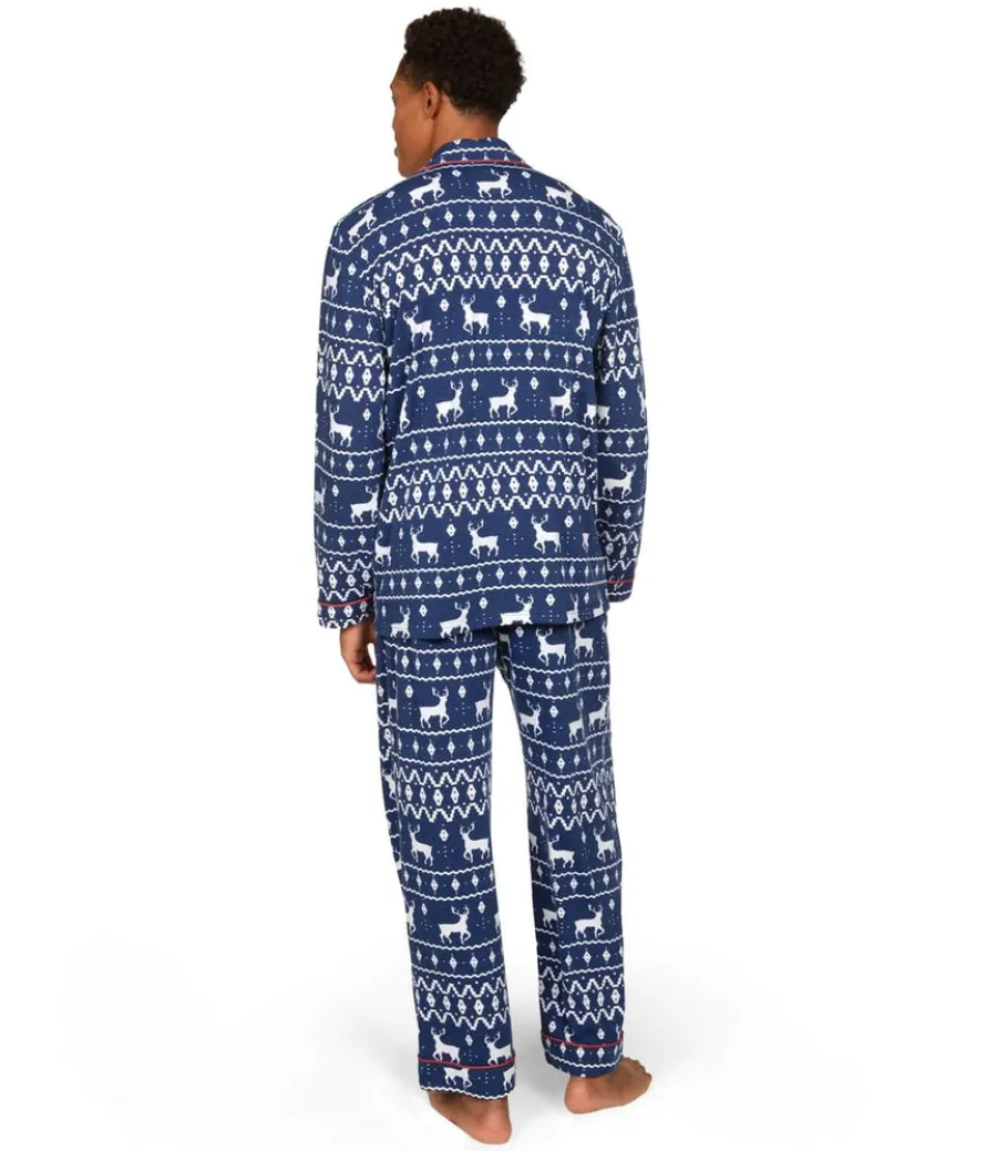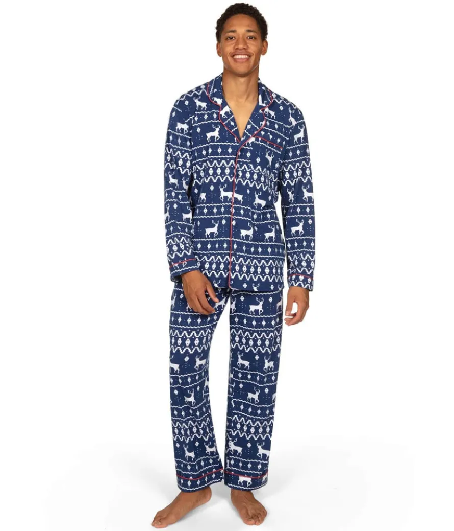 Blue Reindeer?! Can they still fly?! Will I still get everything on m– I mean, gee, are they okay?! No need to panic – these blue reindeer solely come in the form of extremely comfortable pajamas in the Men’s Blue Reindeer Pajama Set! In fact, they aren’t blue at all; these reindeer are an adorable snowy white on a dark blue background for an elite holiday slumber.