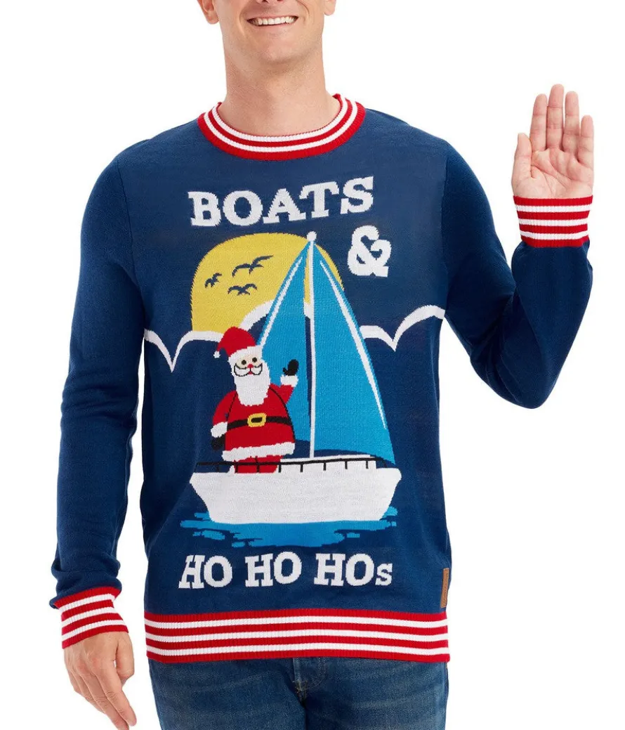 What’s Santa’s favorite party? Look no further than the Men’s Boats & Ho Ho Ho’s Ugly Christmas sweater. Throw this sweater on and you’ll be wearing the picture of holiday spirit – partying it up on a boat, captained by none other than Kris Kringle himself. Rain or shine, we’re having a good time. Hop on board and bring your jolliest ho ho ho’s.