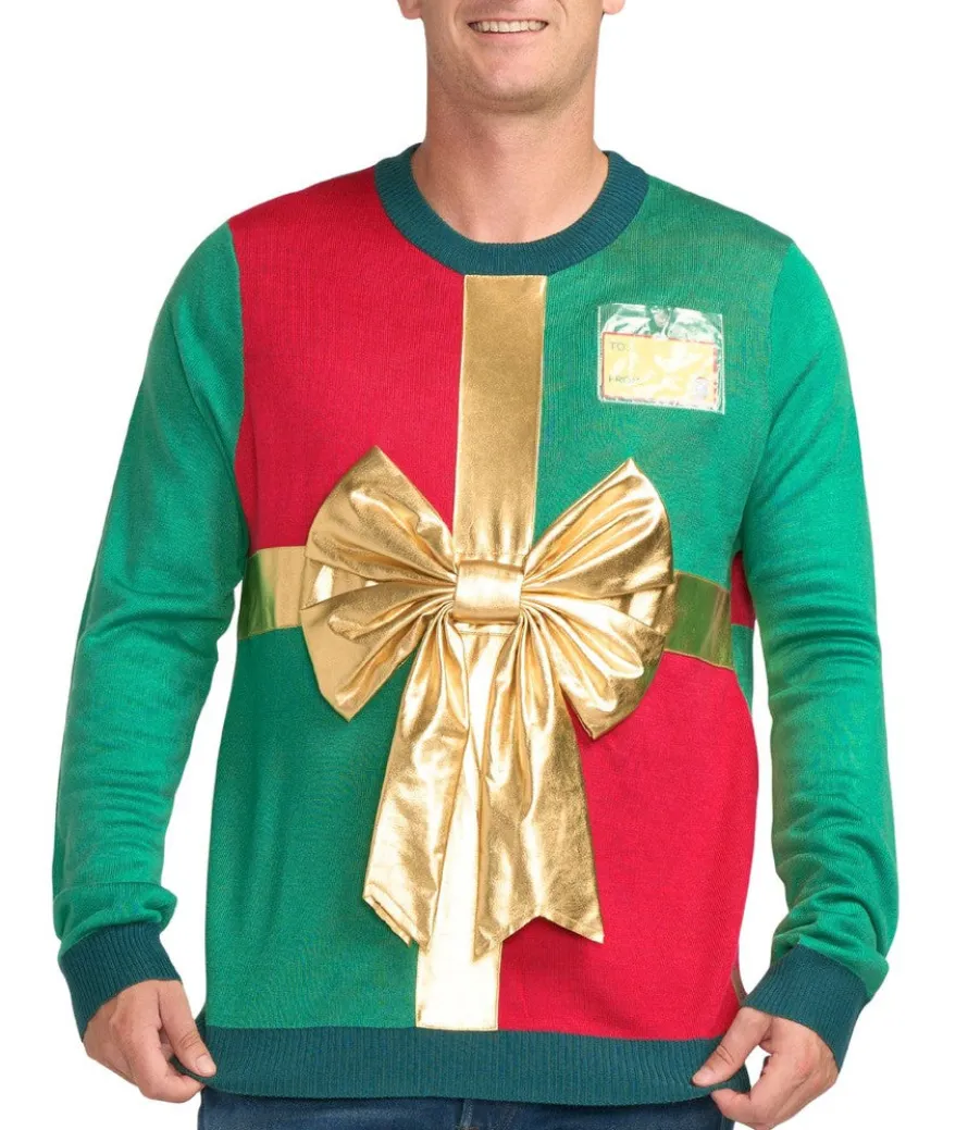 Wrap yourself up with this awesome Christmas present sweater and become a gift to the world. This sweater rocks the classic Christmas colors, red and green, for the wrapping paper and is tied all around with some gold ribbon. It even has a place to write who this awesome gift is for and who it is from. Do not shake this present as it may cause damage.