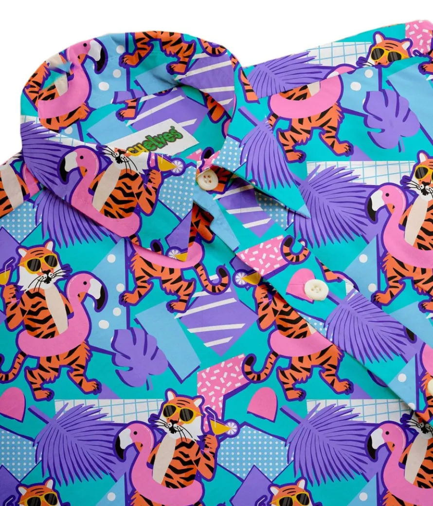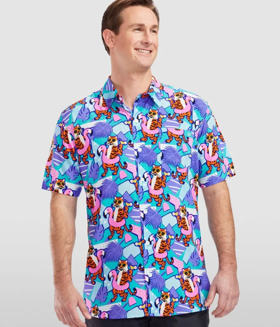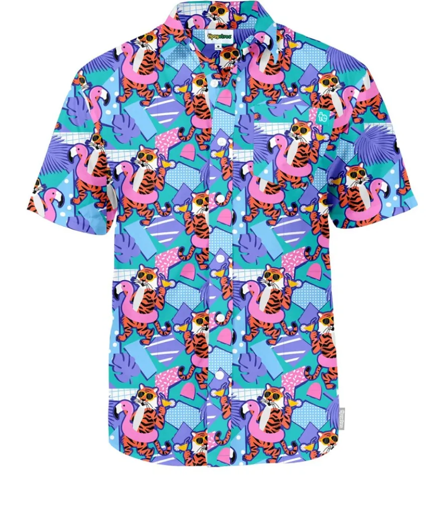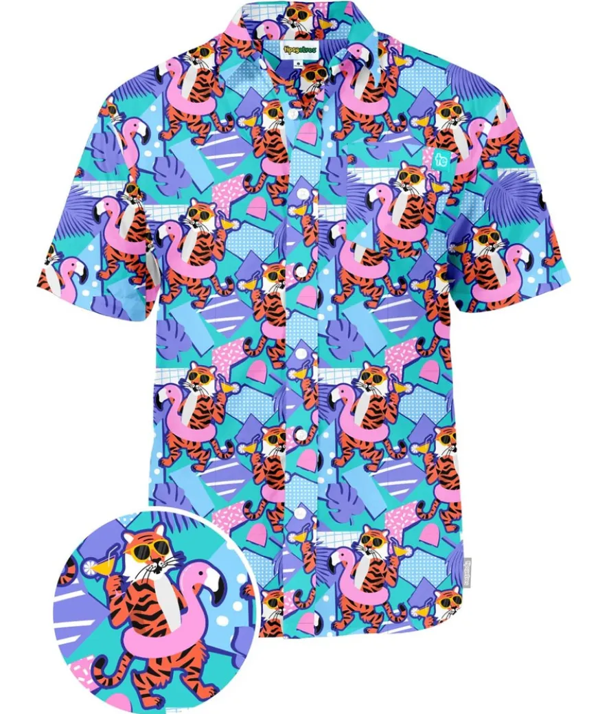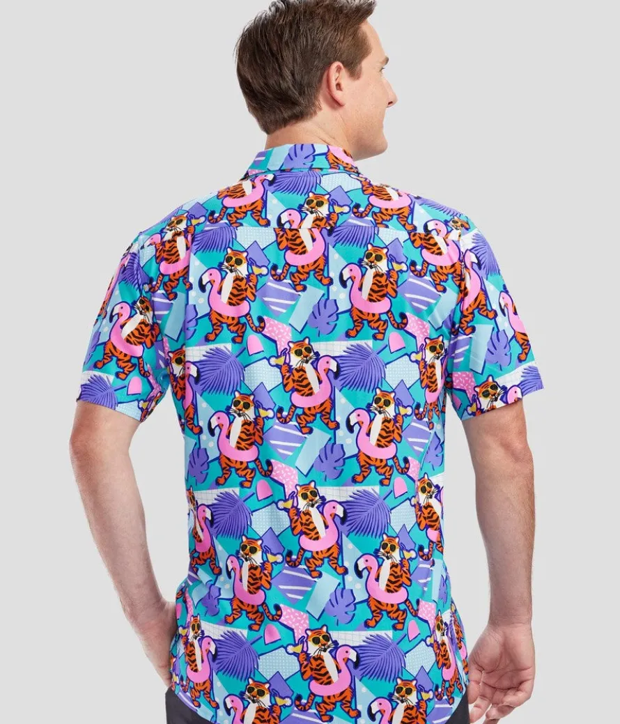If you’re gonna be a cat, be a cool one. The popular phrase of the past comes to life in a whole new way on the Men’s Cool Cats Hawaiian Shirt! Bet you cool cats didn’t picture yourself as a tiger in a flamingo floatie carrying a summer beverage. Well, you will now – and you’ll be all the better for it.