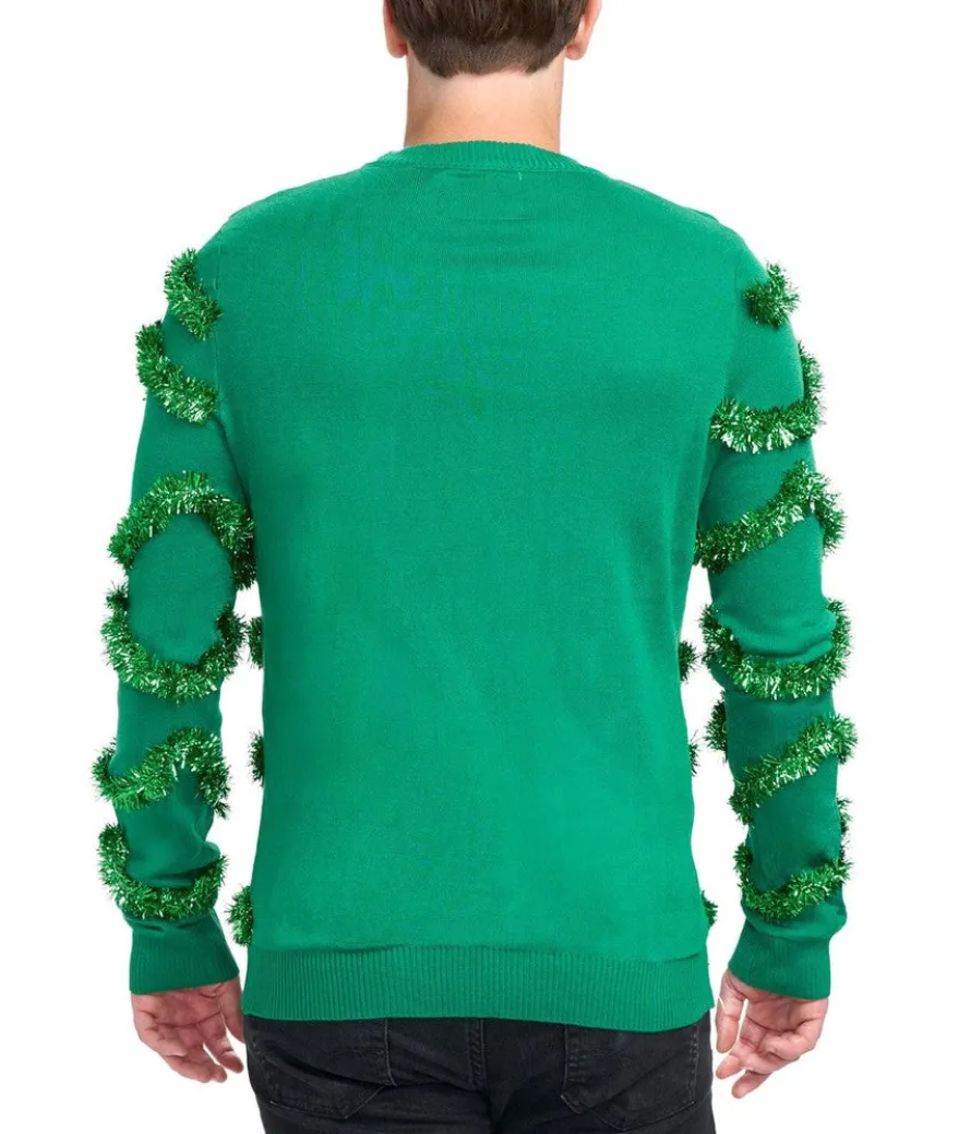Haul out the holly, because it’s time to tinsel the crap out of your holiday wardrobe. This men’s gaudy garland ugly Christmas sweater is punctuated with baubles that shine and catch the candlelight in a nostalgic way that’s almost enough to make your eyes tear up. Actually, this wonderfully tacky design will probably make a lot of people cry.
