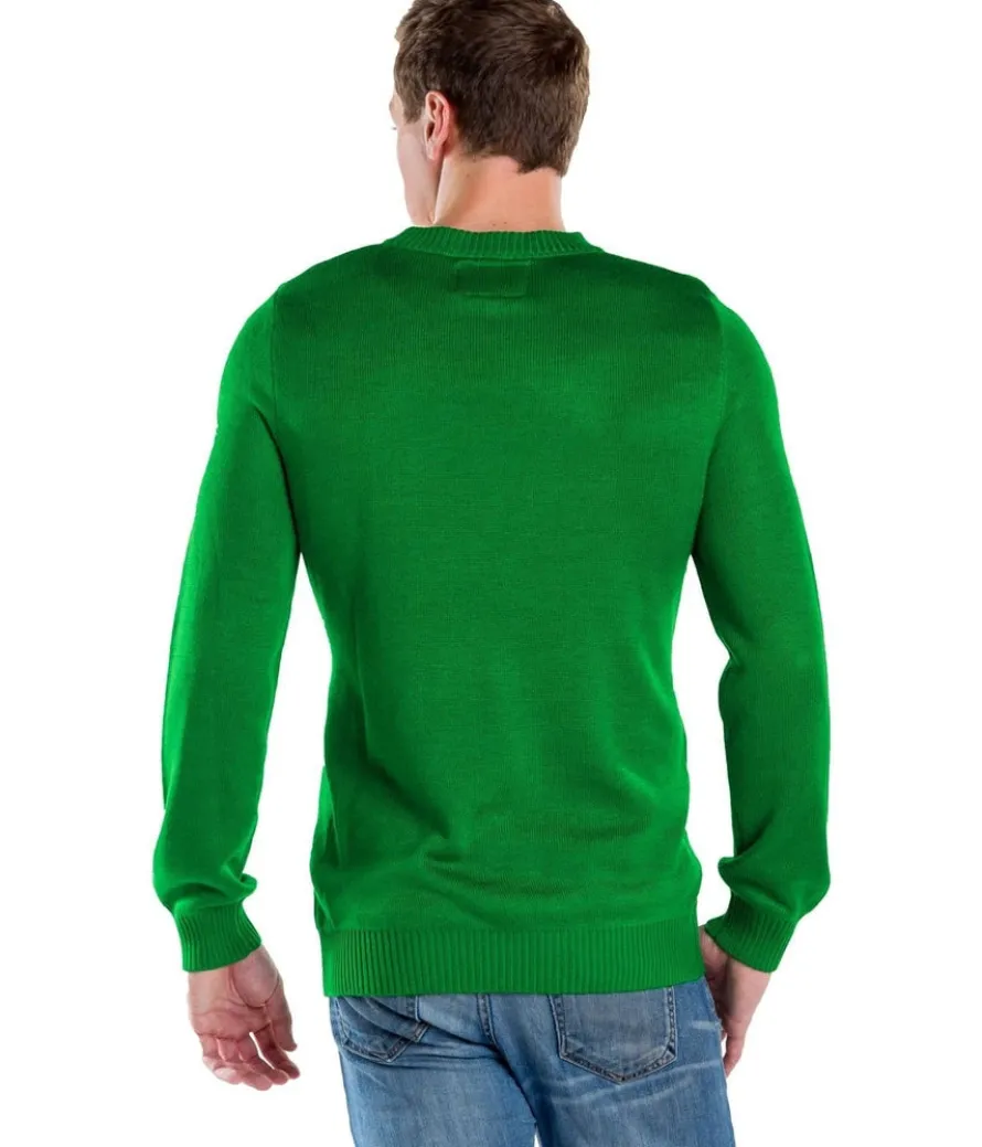 If He’s the reason for the season, it’s time to celebrate! This Christmas sweater features the Son of God himself, complete with a party balloon. A festive white dove with a red ribbon around its neck soars above, while the Birthday Boy stares solemnly from underneath a rakish party hat. This Christmas sweater has a solid green background.