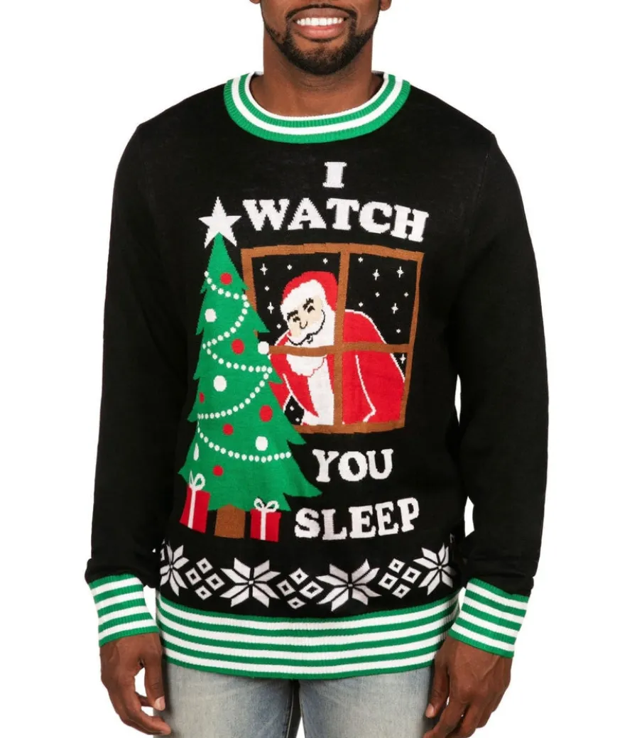 When you think about it, Santa’s always been just a tad creepy. Start a debate at your next Christmas gathering with this Men’s I Watch You Sleep ugly Christmas sweater. Whether you’re feeling naughty or nice, you’ll love the super lightweight fabric and the more than suggestive saying. Just hope the kids don’t ask questions – you won’t want to give up the annual milk and cookies.
