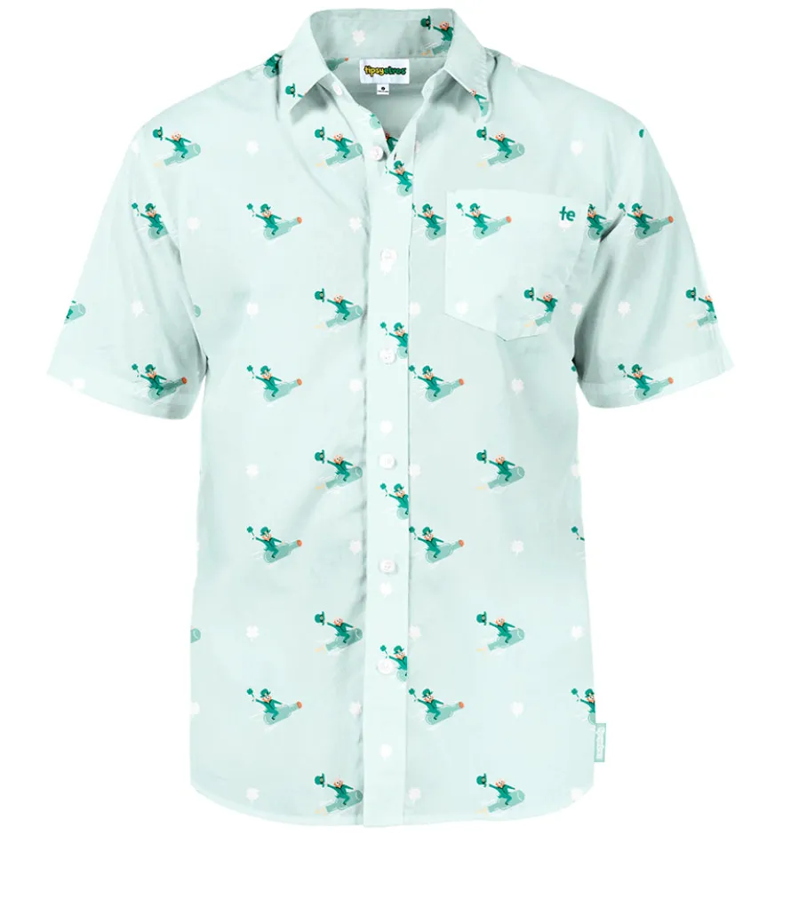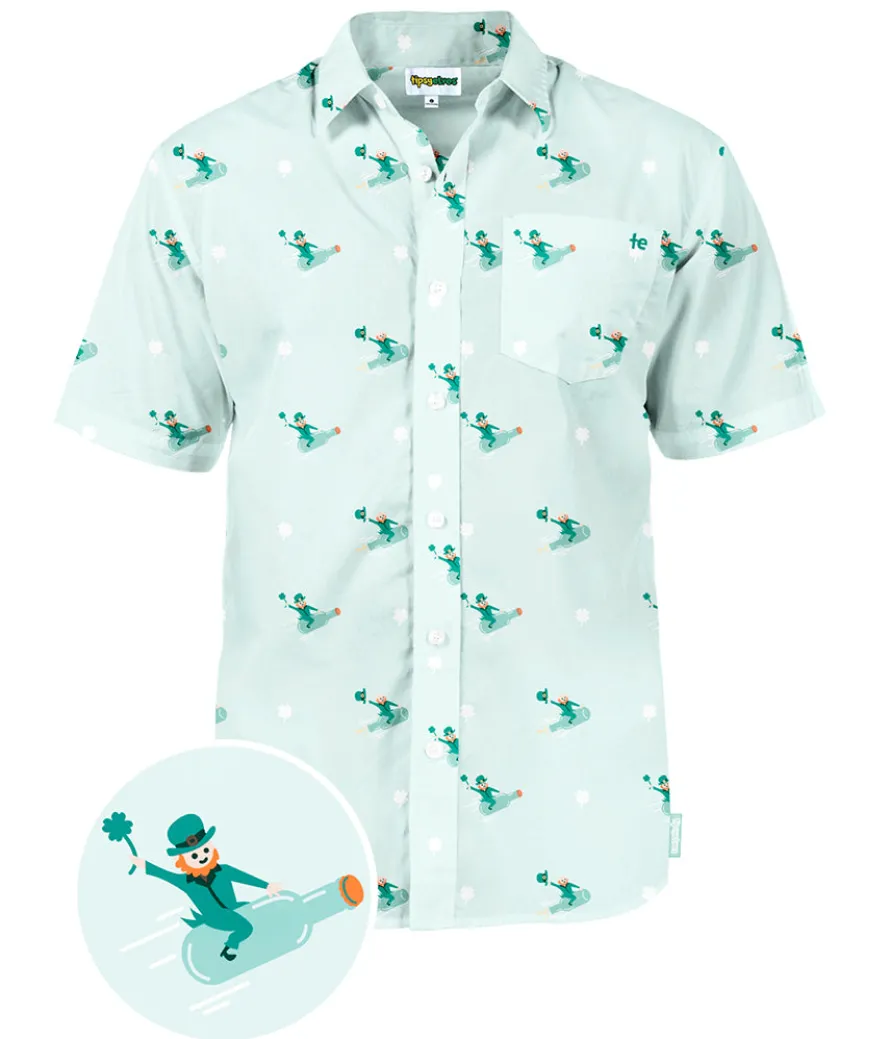 I-rish I could fly. Well, you’ll no longer have to wonder what flight is like, because the Men’s Leprechaun Liftoff Button-Down Shirt is here, just in time for St. Patrick’s Day 2022. Imbued with the great green spirit, the shirt’s pattern pays homage to leprechaun astronauts who rode rockets just like the pinup girls on bombers back in the day. It’s a comfy, collared shirt that is casual with just enough dress-up energy for getting down to business on St. Paddy’s Day. Wear the Men’s Leprechaun LIftoff Button-Down Shirt and show ’em all how high you can get on the greenest day of the year!