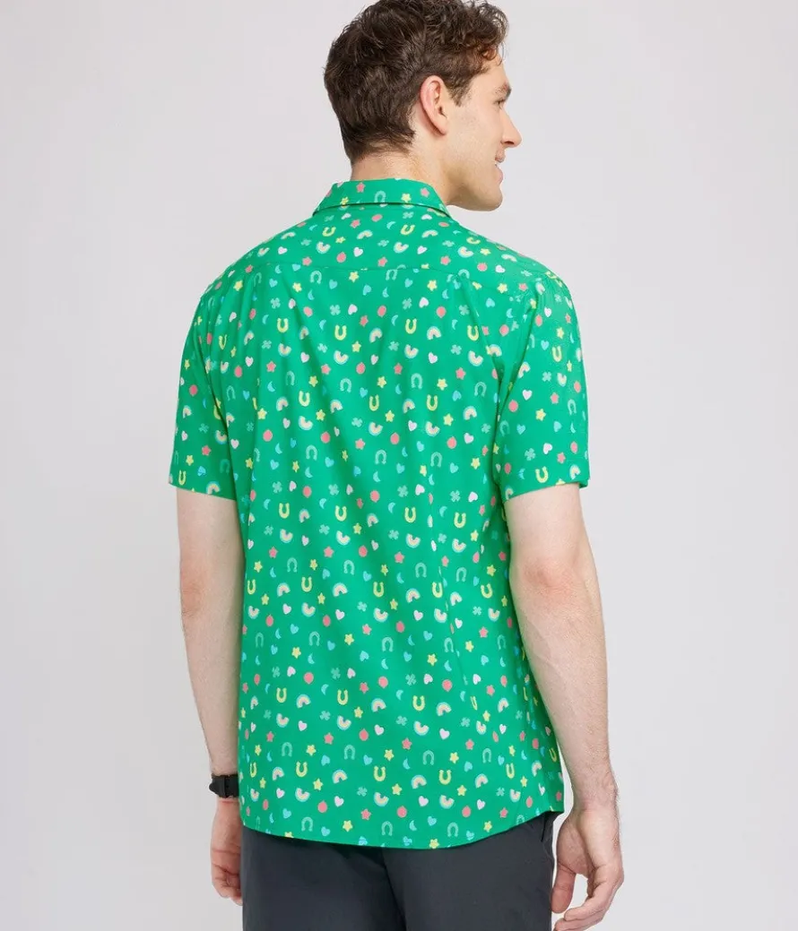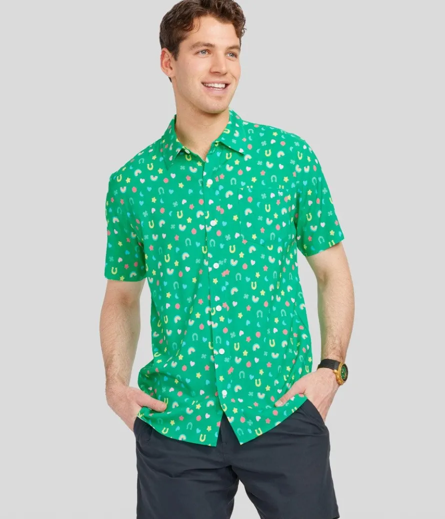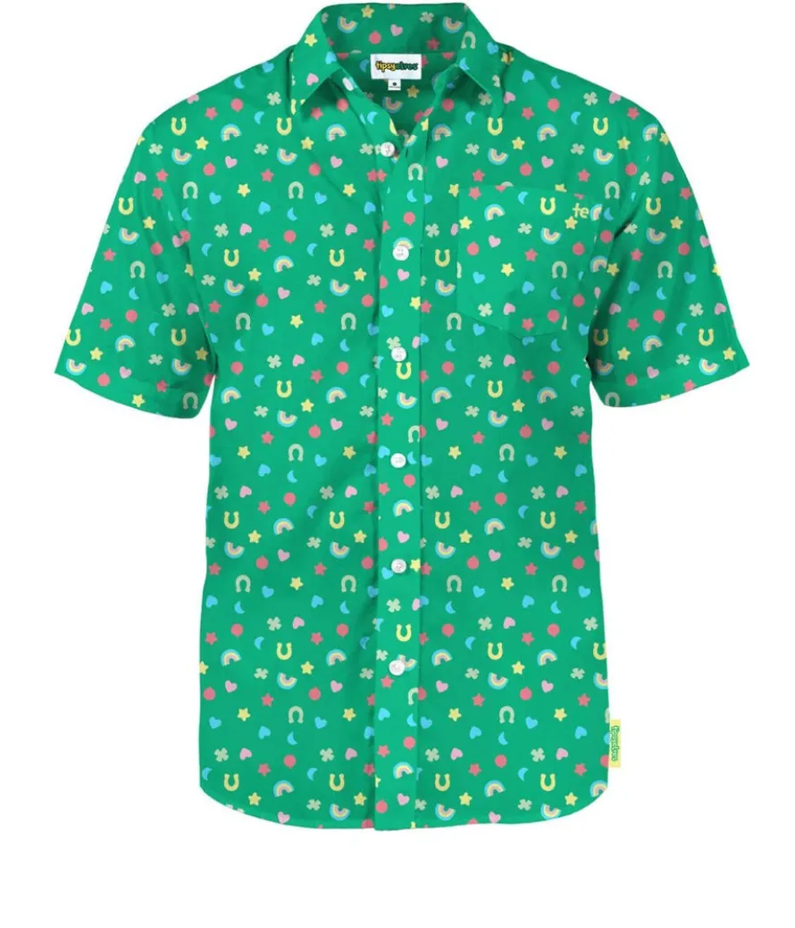 Ever feel like they’re always after your lucky charms? It’s no wonder with this Men’s Lucky Charmer Hawaiian shirt, which is festooned with traditional Irish symbols for St. Paddy’s Day. Featuring rainbows, shamrocks and more, we’ve crammed just about every Irish tradition into this adorable button up shirt you could possibly think of – minus the whiskey. That one’s all yours.