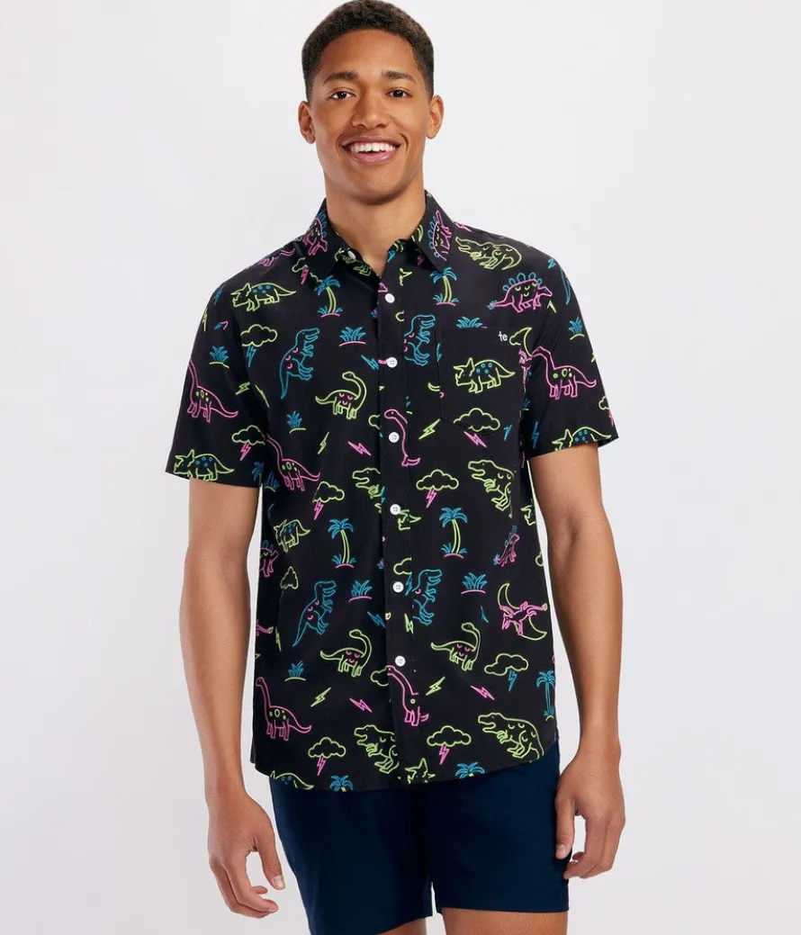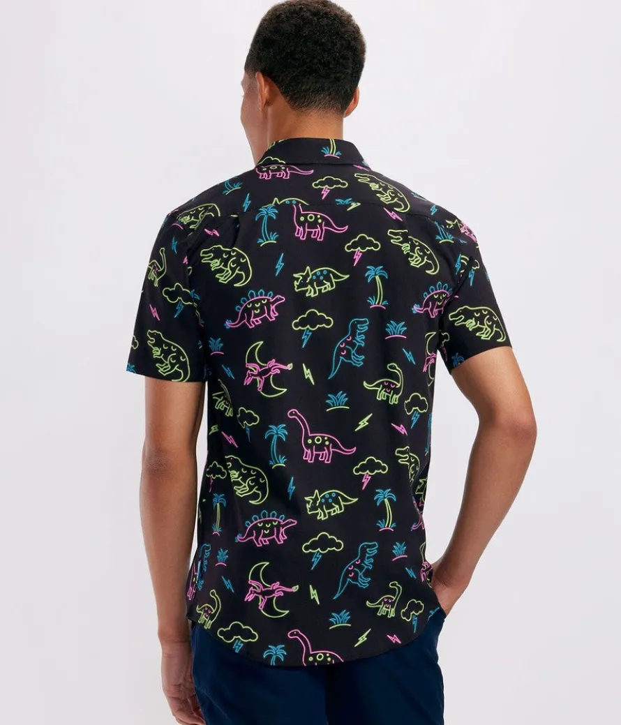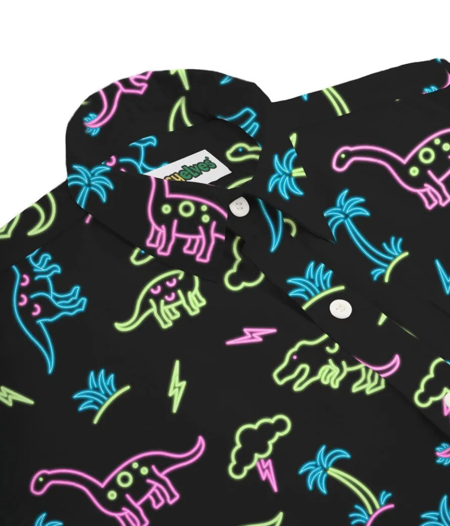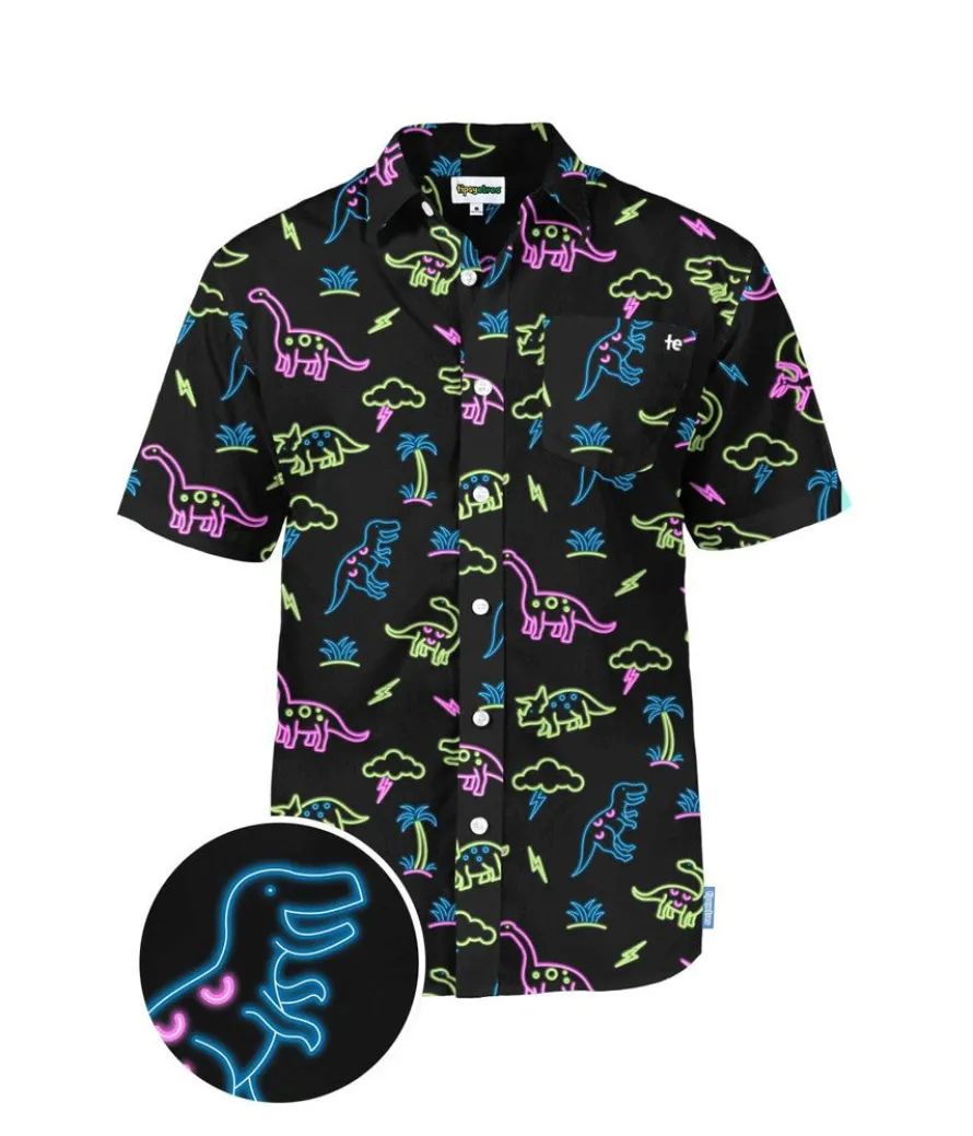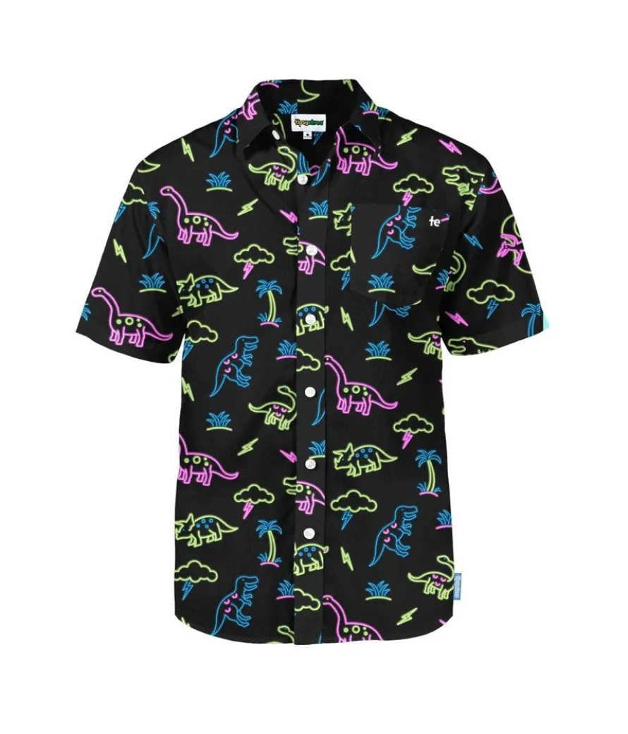 If the dinosaurs of years past could have one thing, it would be the ability to see themselves as neon signs. Studies have proven this – take our word for it. We’ve made their wildest dreams come true in the Men’s Neon Dinosaur Hawaiian Shirt! All of your favorite dinosaurs have joined the party, with unpredictable weather weaving in-between. Lightning bolts meet Bactrosauruses in this wearable lite bright board of your dreams.