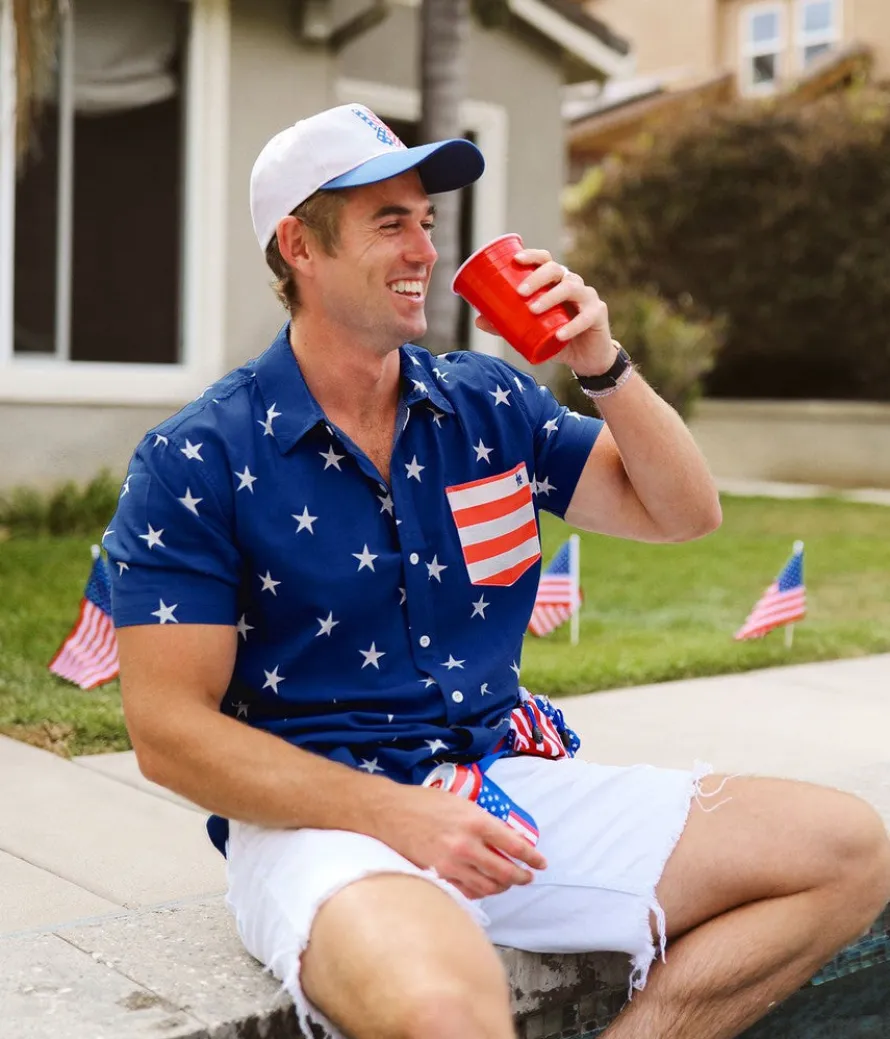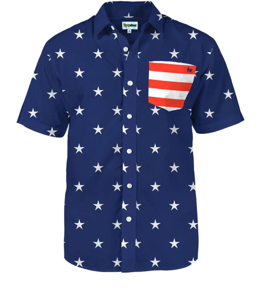 Gentlemen – are you in search of something more sophisticated this Fourth of July? Skip the tuxedo and go for something patriotic and classy with our Men’s Old Glory Hawaiian Shirt. This dark blue homage to the star spangled banner keeps it classy with a striped pocket and stars all over your torso. Button it up and make your way to the front of the barbecue line.