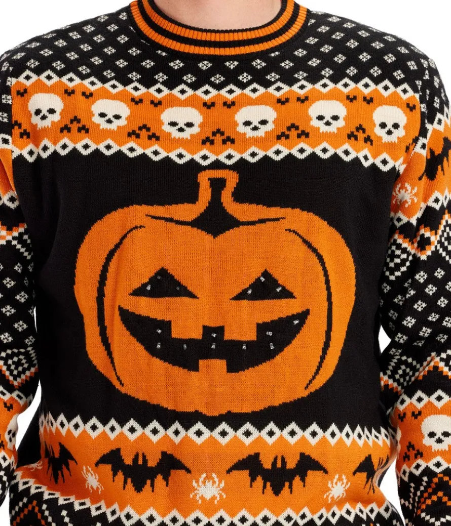 What’s a pumpkin without a little light? We didn’t do all this carving for no illumination. Jagged teeth and all, we’re ready to show it off. Boast your beautiful craftsmanship in the Men’s Pumpkin Light Up Sweater, and light up your jack-o-lantern all season long.