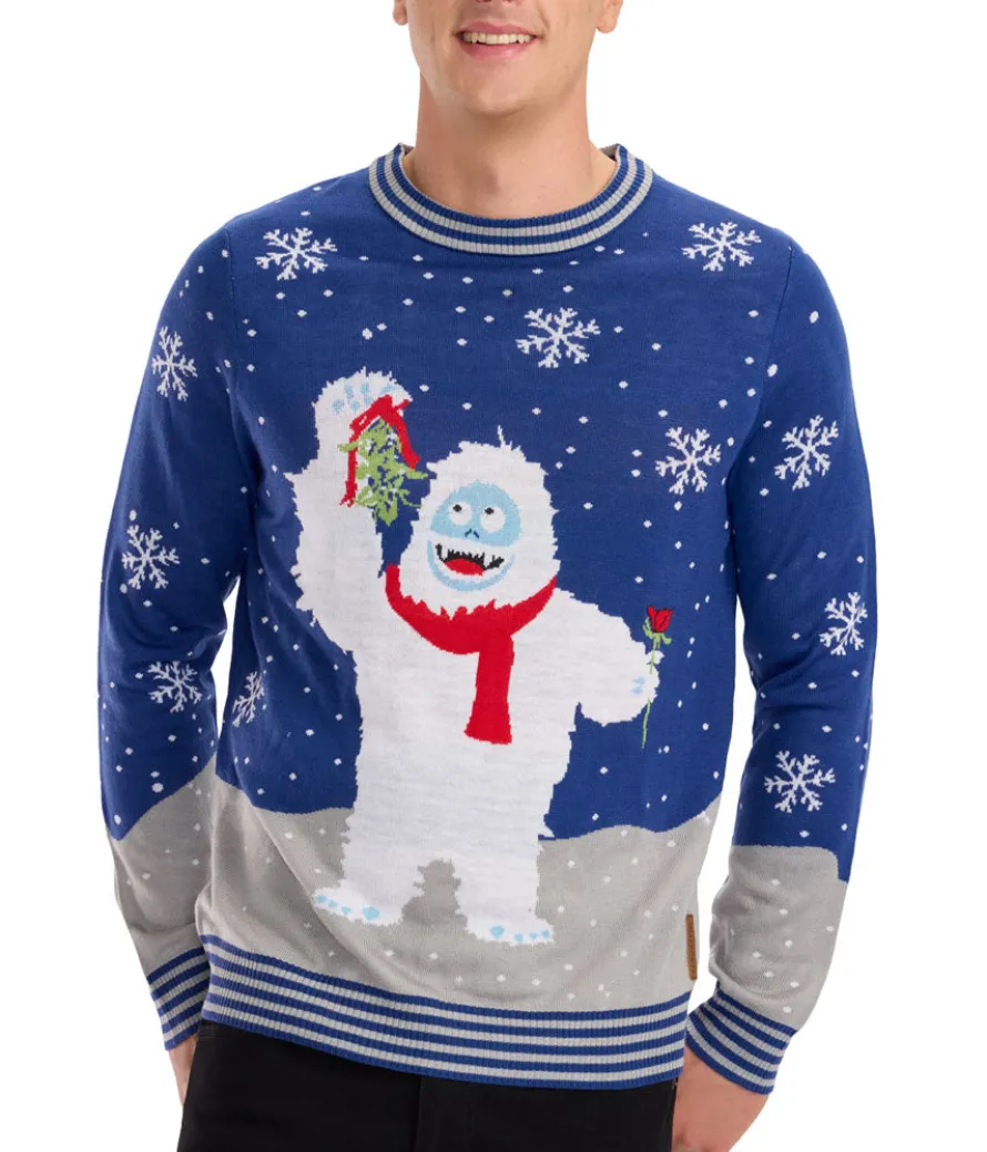 Let’s be honest – Bumble has always been more adorable than abominable, and this Men’s Romantic Bumble ugly Christmas sweater proves it. Bumble is doing the heavy lifting as your wingman with a rose in one hand and mistletoe in the other. (Maybe that’s where The Bachelor came up with the idea?) Once your bae peeps you sporting this, you can pretty much count on another present showing up under the tree.