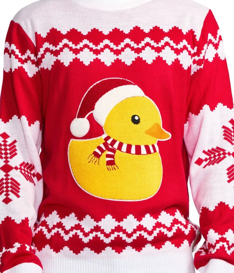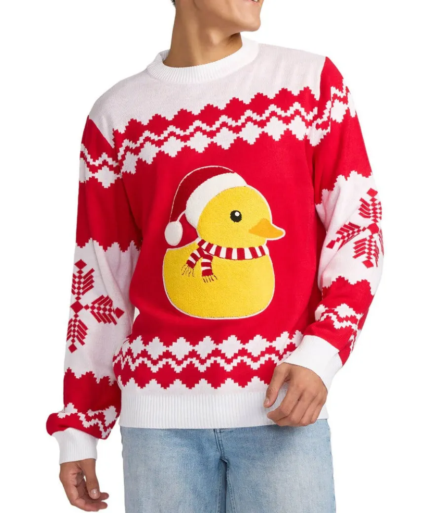 Ah, the holidays. Getting together with long-lost family, making time to relax, and mingling with old friends over wine, cheese and crackers. Or should we say, quacker? Keep the childhood Christmas dreams alive in the Men’s Rubber Ducky Ugly Christmas Sweater, showing the seasonal variation of your favorite bath toy from back in the day.