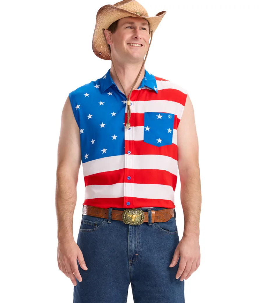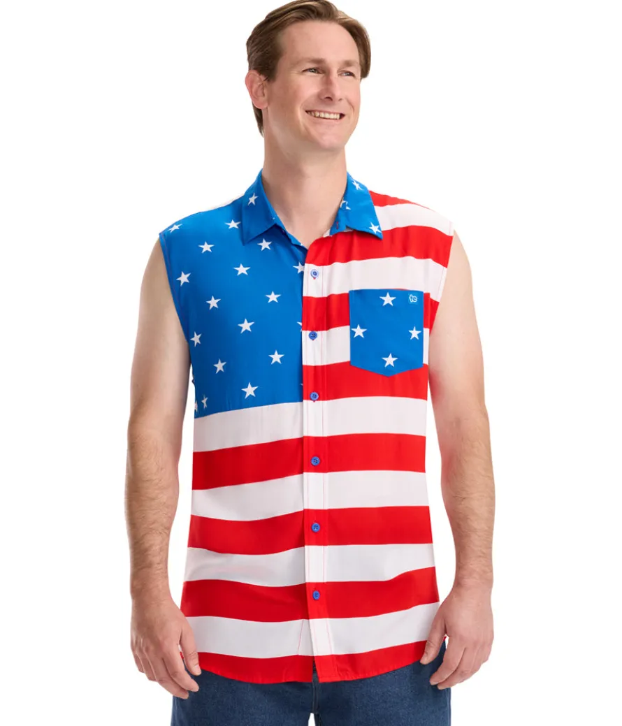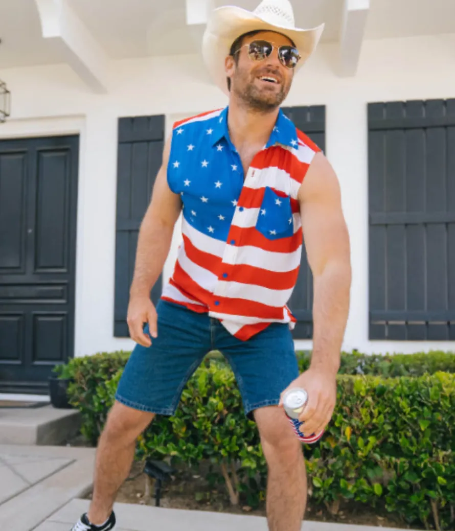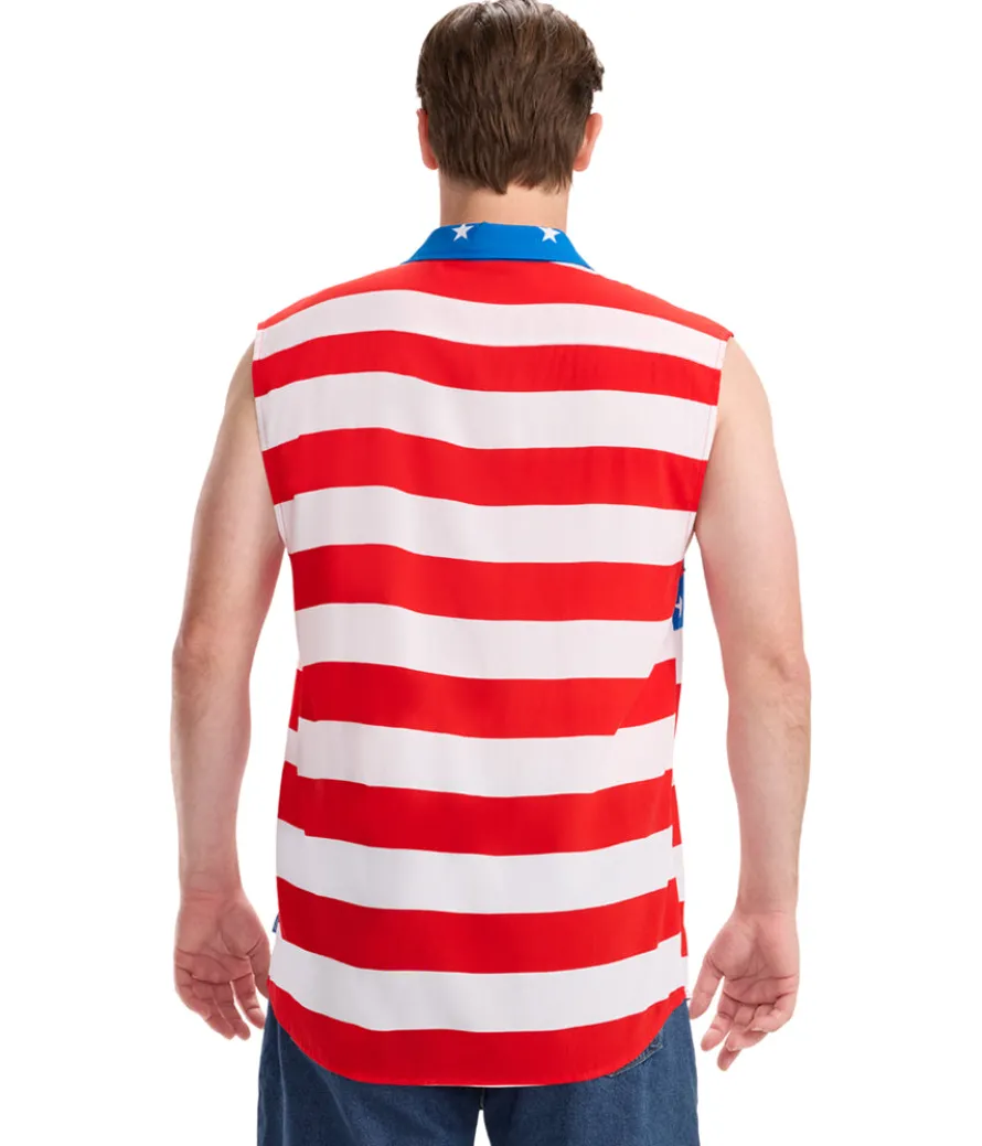 Celebrate the land of the free biceps. Stand out while saluting the stars and stripes in the Men’s Sleeveless Stripes Button Down Shirt. This sleeveless wonder combines the classic button-down look with bold red, white, and blue stripes. Made from lightweight fabric, it’s ideal for hot summer days and Fourth of July festivities. The tailored fit ensures you look sharp, while the sleeveless design keeps you cool. Be the life of the party with this patriotic twist on a classic style.