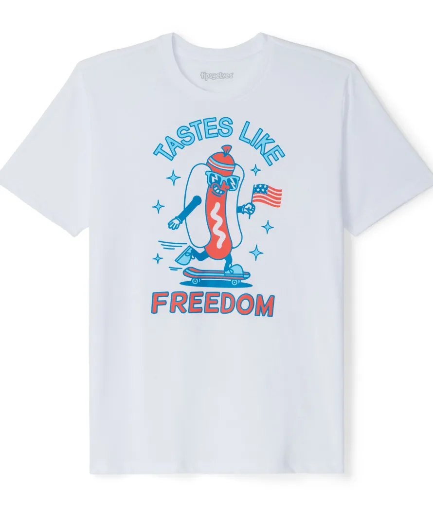 Nothing says America like hot dogs and freedom. The Men’s Tastes Like Freedom Hot Dog Tee combines both in a deliciously bold graphic. Made from soft, high-quality cotton, this shirt is perfect for barbecues, ball games, and Fourth of July festivities. The playful design adds a touch of humor to your patriotic ensemble. Savor the flavor of freedom with this tasty tee. Hot dogs and freedom unite in the Tastes Like Freedom Tee—a flavorful nod to American traditions.