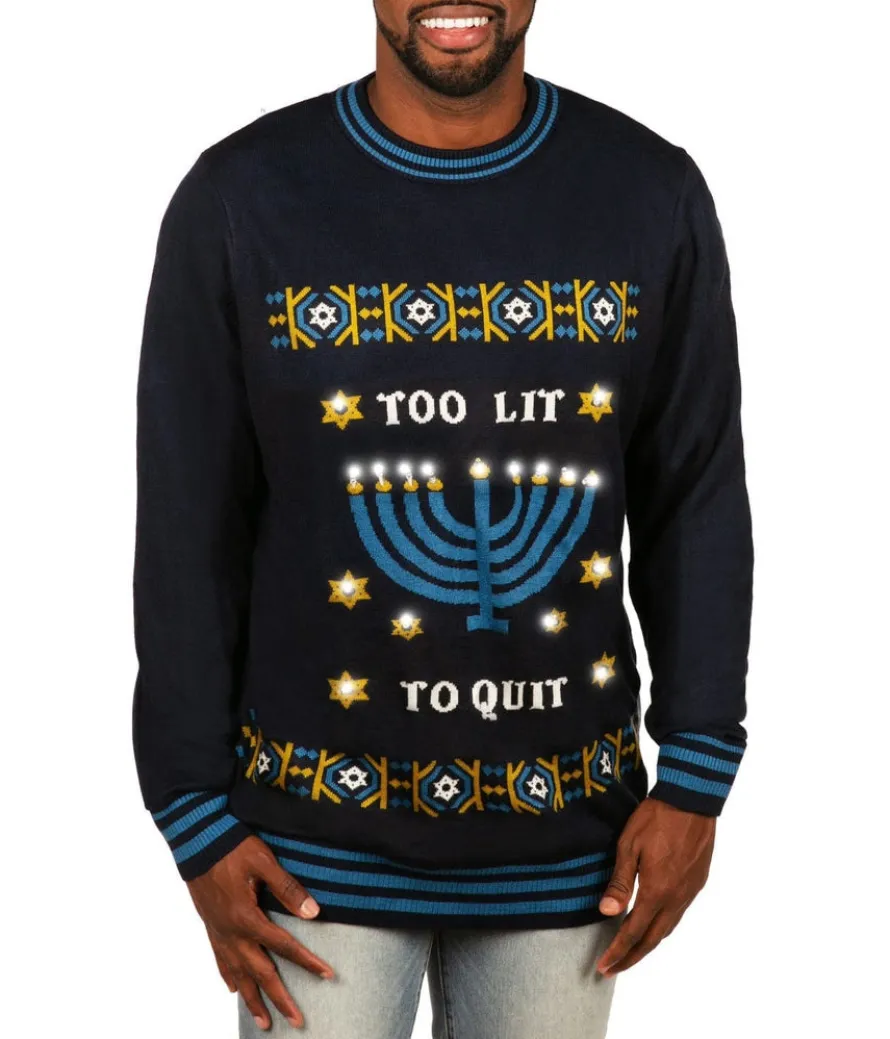 Who said this time of year was only for ugly Christmas sweaters? We’re here to dress up all faiths, and you can’t do it better than this Hanukkah sweater. When we say we’re here for everyone, we mean it – this relaxed fit is ideal for any body type. If that wasn’t enough, it’ll stay lit up for waaay longer than eight days. Shalom!