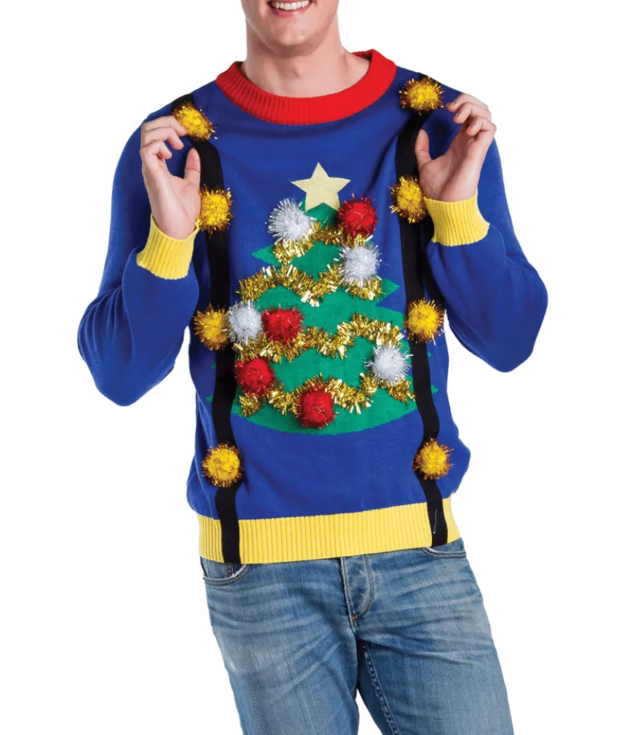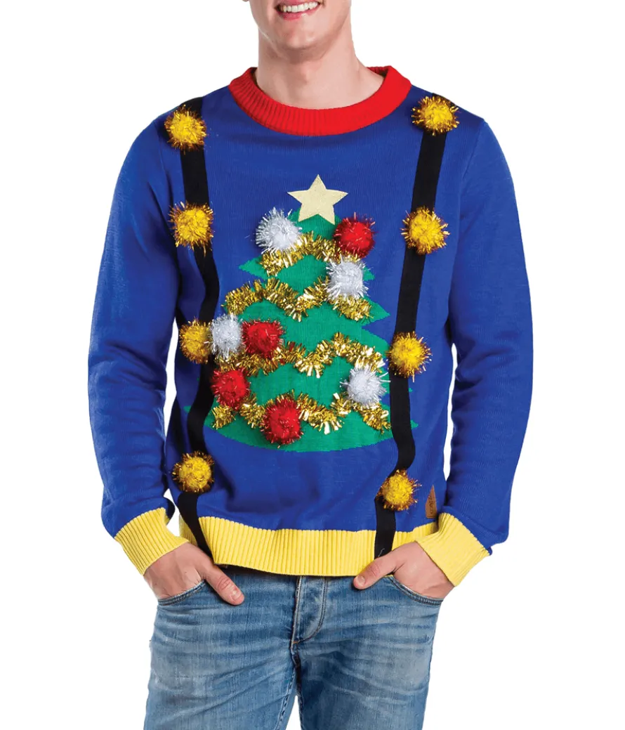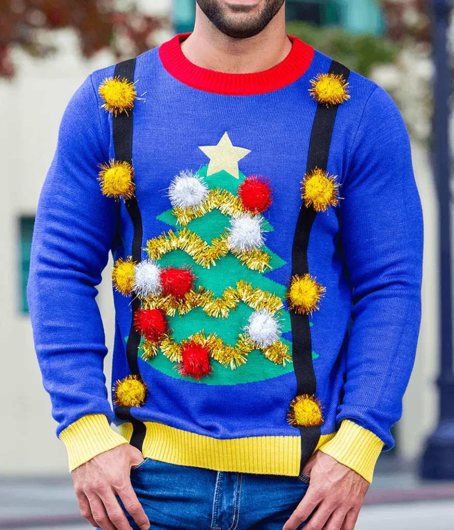 Suspenders always look jolly. Sweaters are super comfy. What if someone figured out how to combine the two? You are in luck – this men’s holiday sweater does just that, with wide black suspenders woven directly into the blue design. Jingle bells on each strap add a whimsical touch, and a huge Christmas tree on the front leaves no doubt as to what season you’re celebrating!