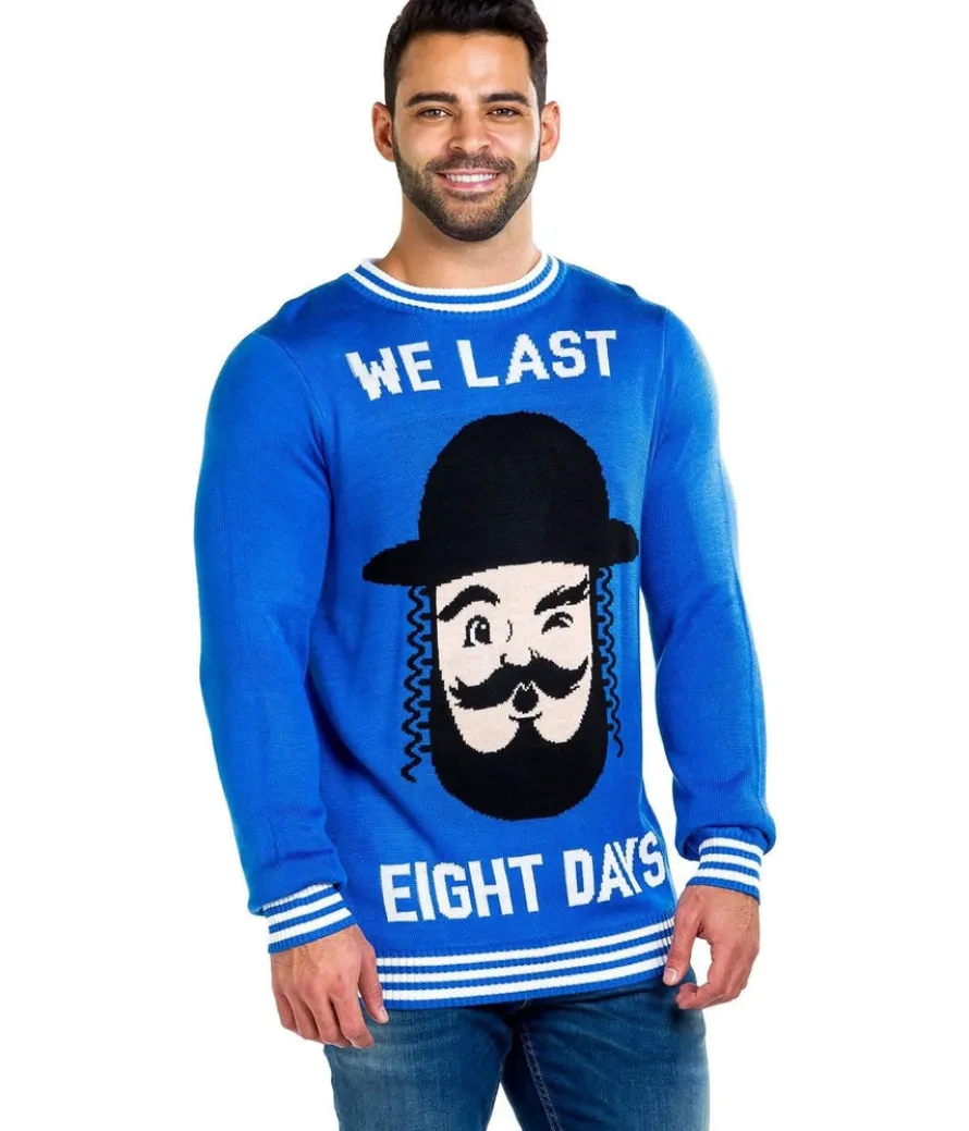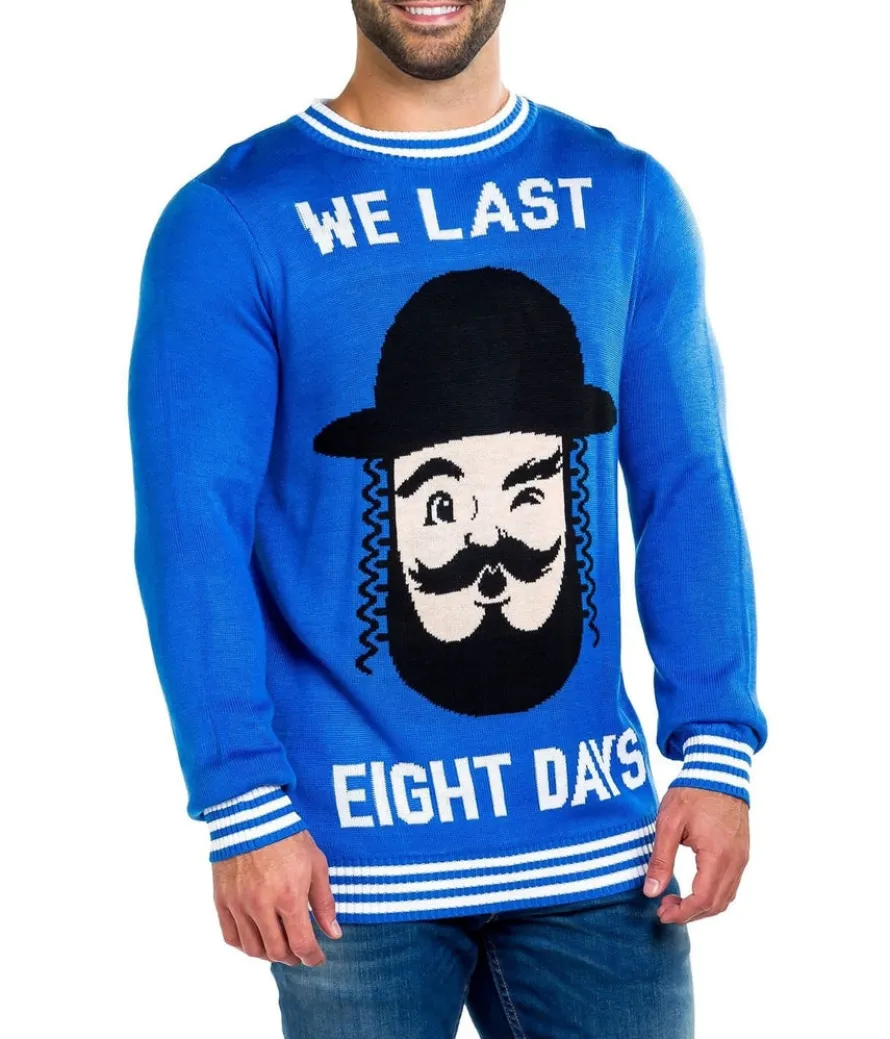 Gentlemen, looking to land yourself a lucky lover this Festival of Lights? Nothing says “brace yourself” better than this blue “We Last Eight Days” Hanukkah Sweater. Available in a calming shade of blue, it’s innocuous enough to wear in front of Grandma, but risqu√ɬ© enough to raise a few snickers at family celebrations. If you’re looking for the perfect gift this Hanukkah, invest in this cozy men’s sweater – it’s even got authentic Stars of David.