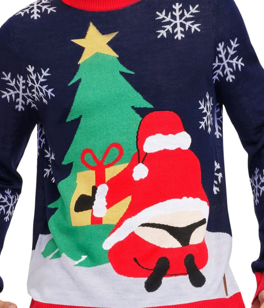 What is Santa getting for Christmas? An atomic wedgie by the looks of this candid shot. Yes, those are the special panties you bought for your girlfriend. He stole them out of her stocking and the rest is history. We can’t blame him though. When you’re dressed in a sweaty red wool suit, choosing between boxers and briefs is just too limiting. It’s one way of showing off your girlfriends gift, in the Men’s Winter Whale Tail Ugly Christmas Sweater.