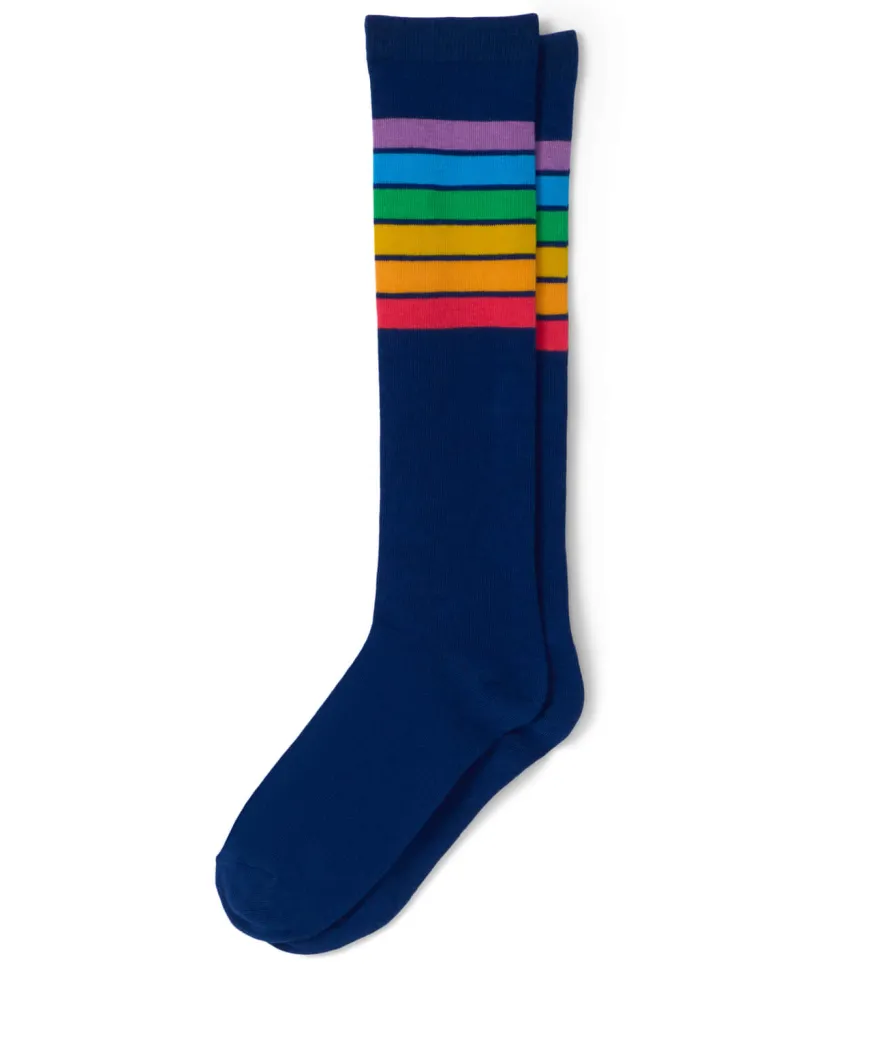 Add a little extra color to your stride with the Navy Rainbow Striped Knee Socks. These ultra-comfy, knee-high socks offer vibrant visibility with a clean navy base and multi-color stripes that shine bright. Ideal for parades, parties, or powering through the everyday.