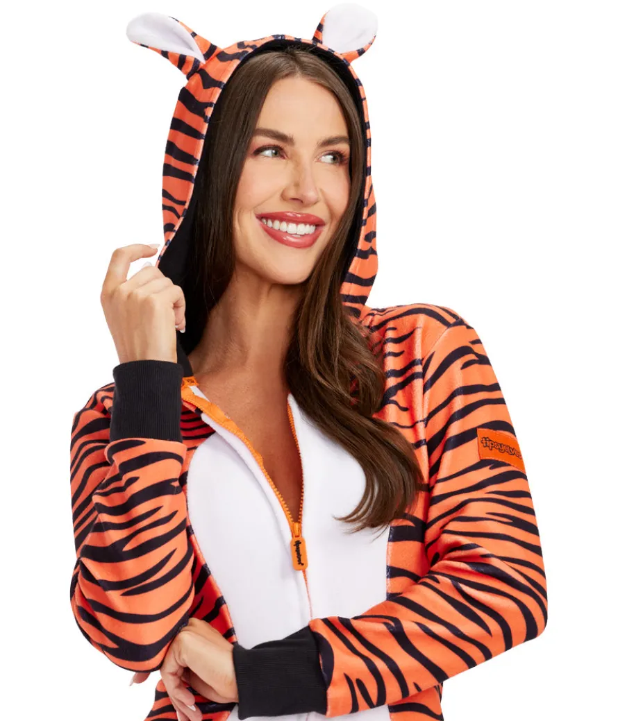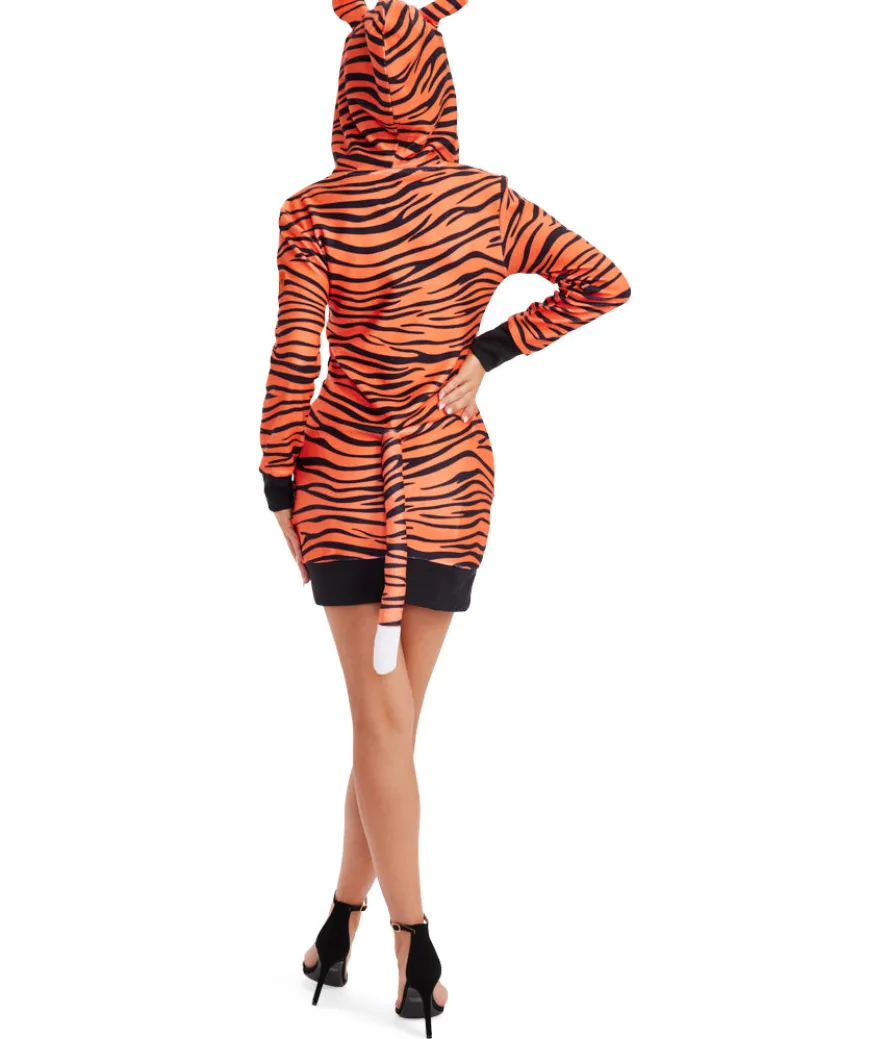 Need an eye-opening Halloween costume in a hurry? Rise up to the challenge of your rivals with this women’s tiger costume. With a soft exterior that will make you purr, our tiger Halloween costume is so comfortable you won’t be able to decide if you want to wear it out or take it upstairs for a nap. Unlike a full jumpsuit, this tiger costume comes as a floaty short dress, giving you room to bounce around on your tail on the dance floor or hunt for candy for hours on end. The long sleeves will keep you warm if you do decide to take it out trick or treating, and the brightly colored black and orange stripes will ensure you’re seen for miles. The tiger costume also comes with a convenient top to bottom front zipper and a cutesy hood with squishy ears. Get your growl on with this feline fantasy.