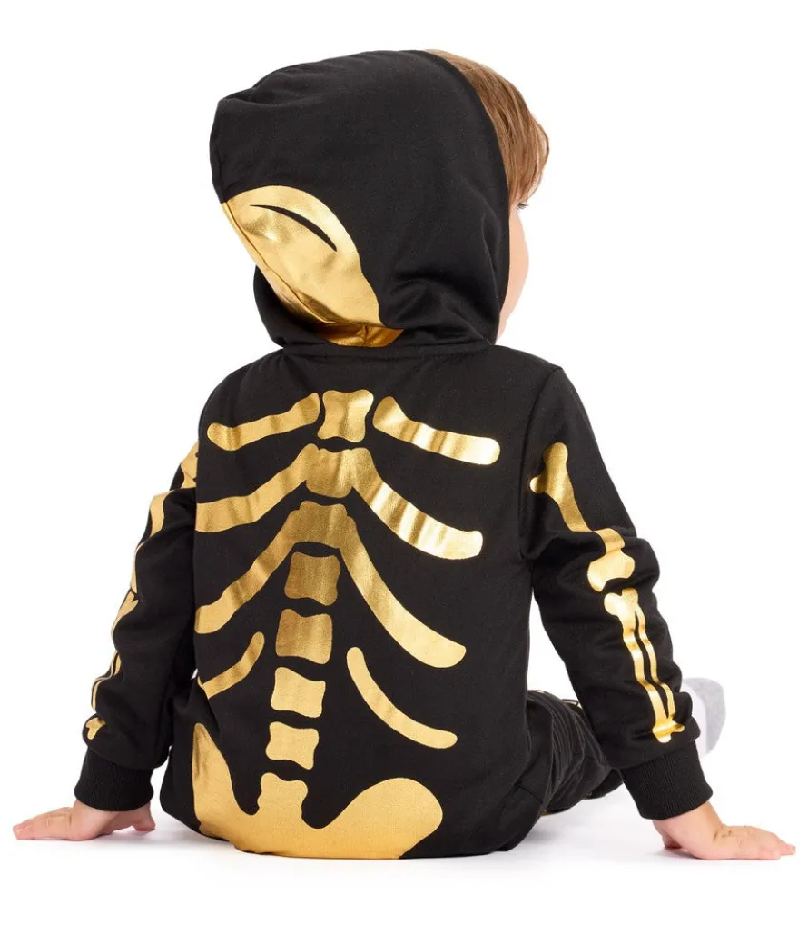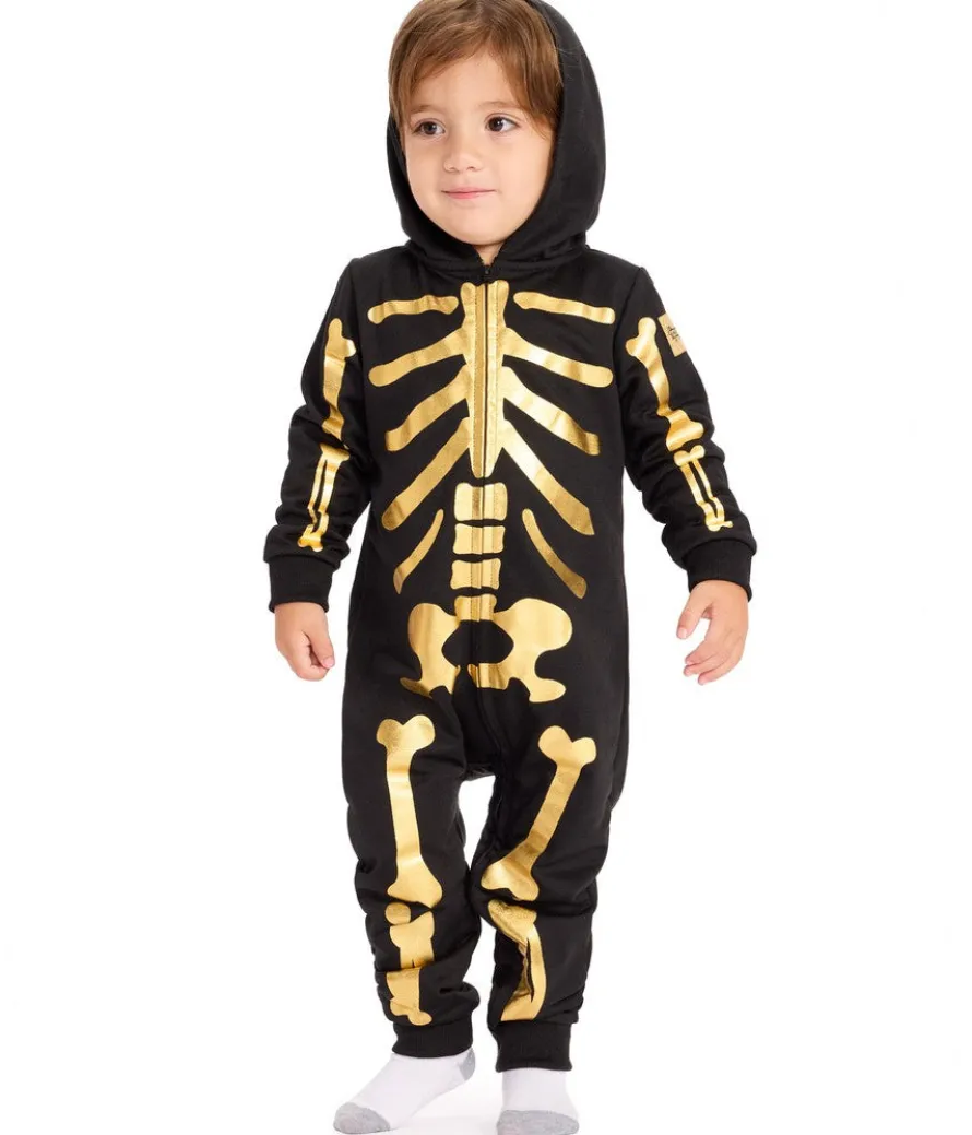 So, your guy wants to be a skeleton for Halloween. Wait til’ he sees this one. Absolutely rattle him in the Toddler Boy’s Gold Skeleton Costume: it’s everything he’s ever wanted,plus the tint of gold. That’s what we call an upscale skeleton.