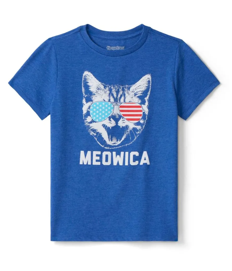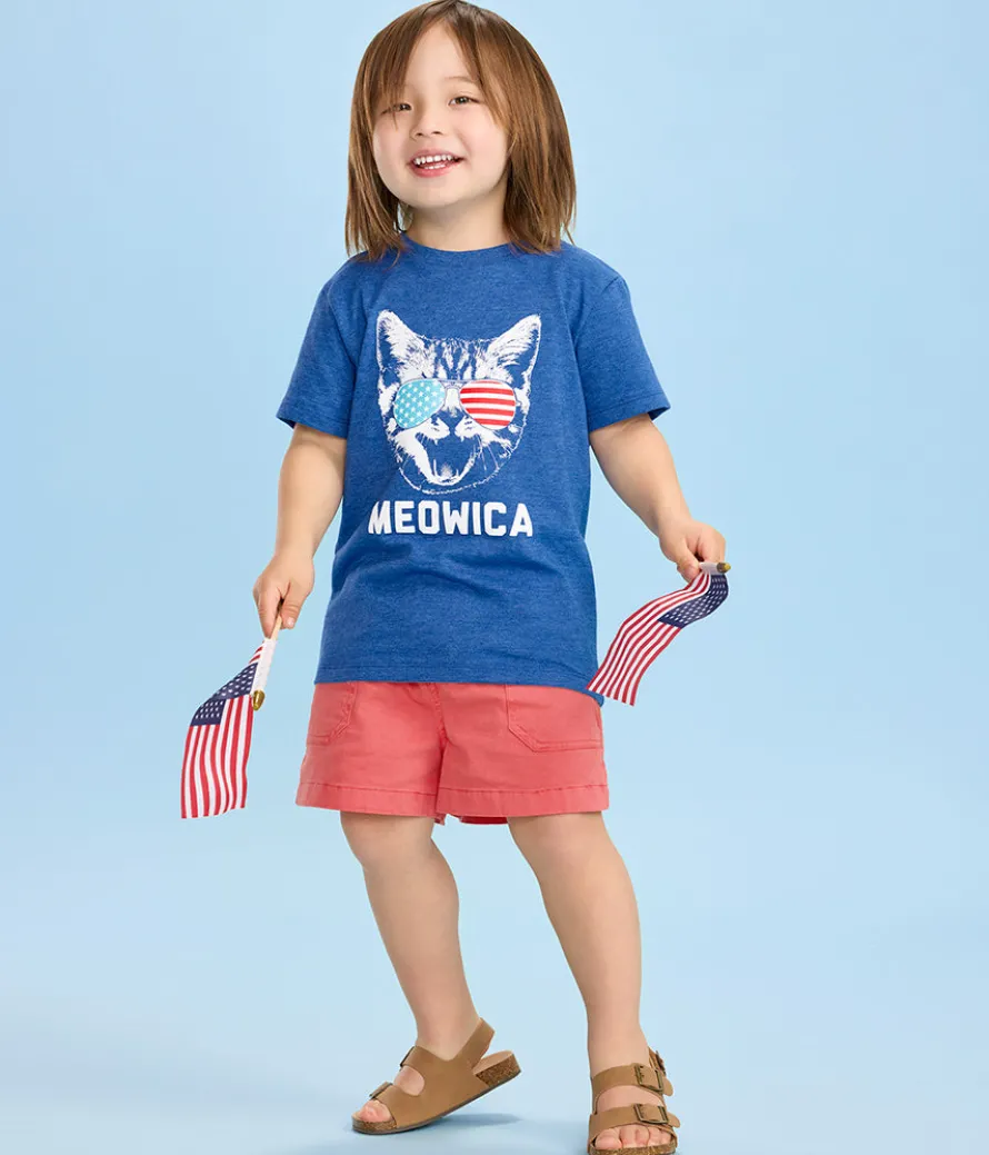 Red, white, and meow. This Toddler Boy’s Meowica Tee features a feline twist that’s both adorable and paws-itively festive. Soft and breathable for nonstop zoomies and backyard play. Because nothing says freedom like cats in costumes. Let the toddler cat-itude shine.