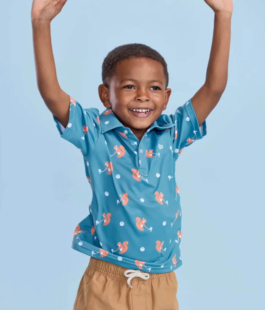 Perfect for nutty adventurers on and off the course, the Toddler Boy’s Squirrel! Golf Polo is lightweight, playful, and made for active toddlers. The breathable, stretch-infused fabric keeps him comfy, while the lively design brings extra fun to his golf wardrobe.