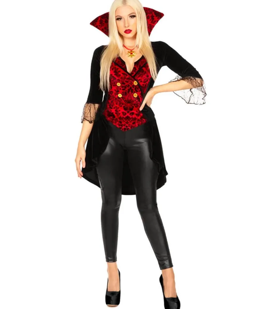 This is our take on another Halloween classic. This Women’s Vampire Costume hits all the highlights: the big collar, the sleek cape, the black lace on the arms — it’s got it all. Having a one piece costume so spot on should take the pressure off you to play an expected character. Maybe instead of turning into a bat and sucking blood, your backstory could be you like making bats and giving blood? Hey, we don’t claim to be Bram Stoker over here.