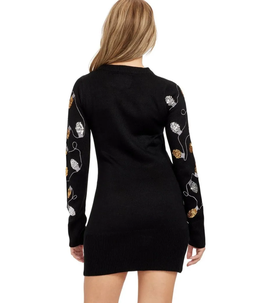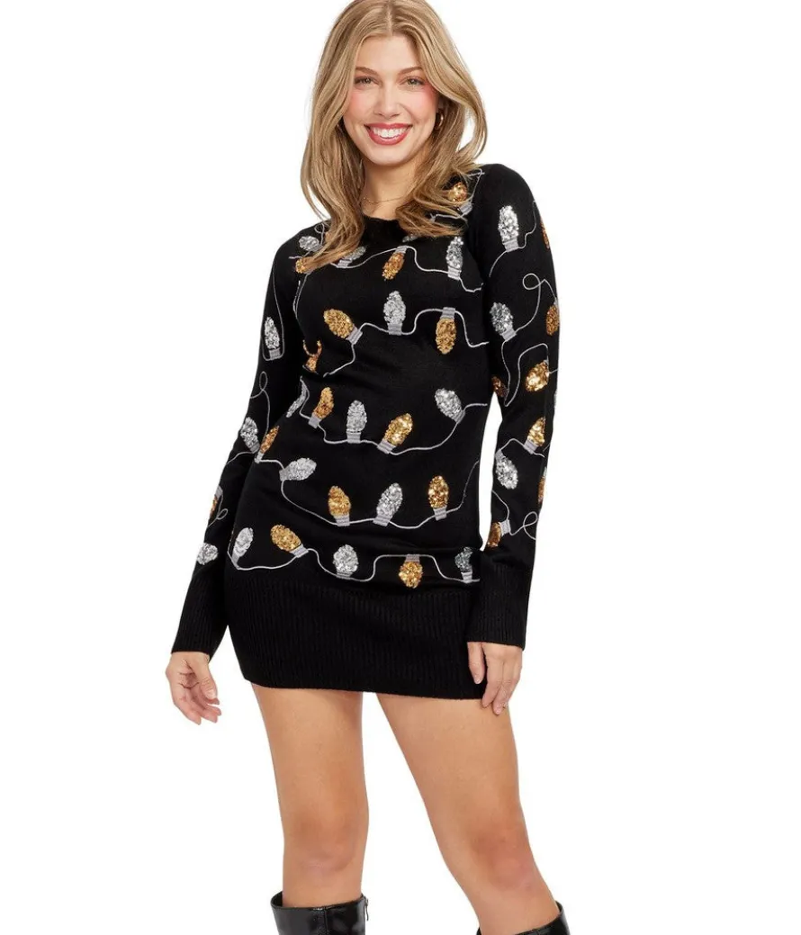 Twinkle your way through the holiday season in our brightest sweater dress to date. The sequined splendor of this Christmas frock is enough to turn heads all on its own. But we know that this women’s Christmas light strand sequin sweater dress will look even better when you dress it up with your favorite metallic heels and dangle earrings!