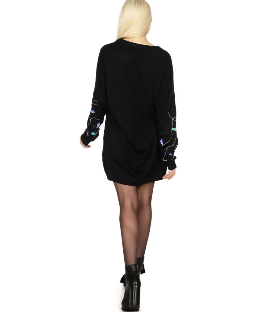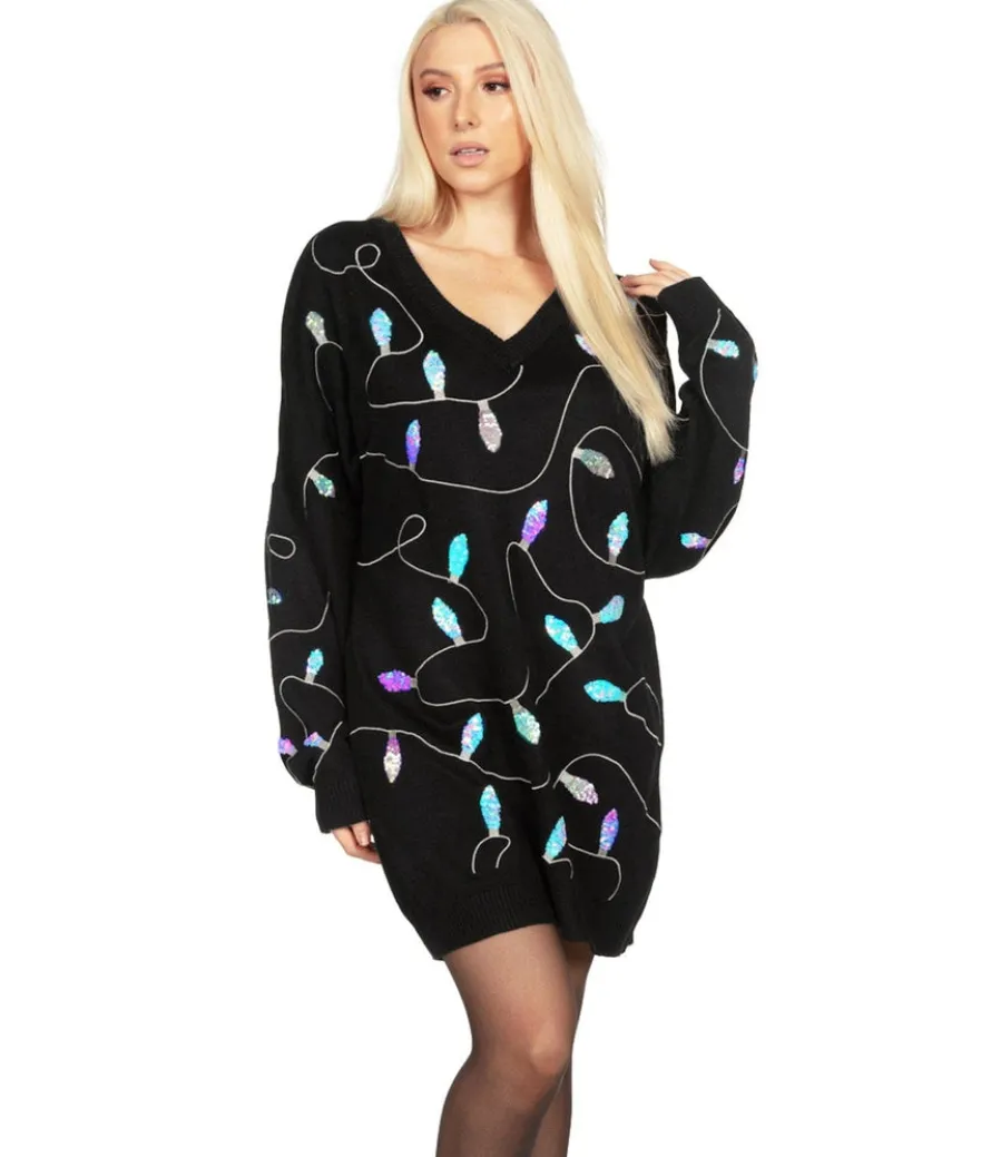 Life of the party is so last year. Step into the new holiday season and be the light of the party in the Women’s Iridescent Lights Oversized Sweater Dress! Tangle yourself in twinkling iridescent sequin lights in this oversized yet flattering sweater dress to keep you comfy and cozy.