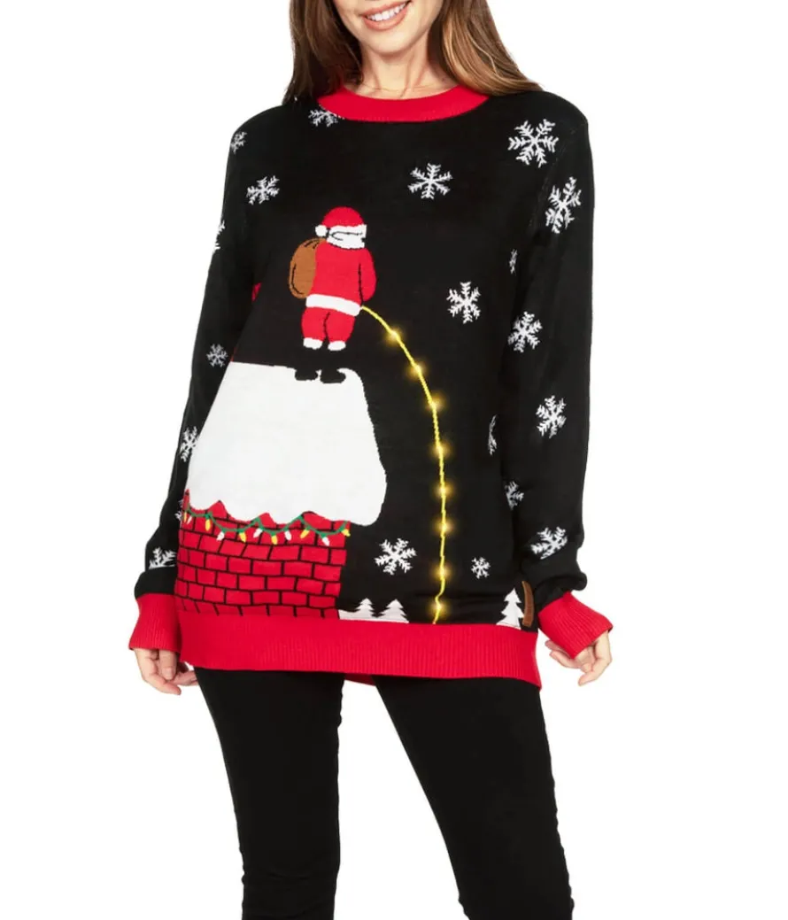 Did you guys feel that? I think it’s sprinkling – but the sky is clear as day. We’d say it was the sprinklers, but those aren’t on either. Things aren’t always what they seem – stop searching for the logical solution and throw on the outlandish Women’s Leaky Roof Light Up Oversized Christmas Sweater! If the roof is on fire, you know who to call.
