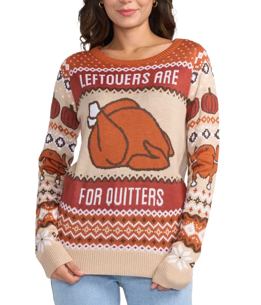 This one’s a bit of a bold statement, but there’s truly no time like the holidays to do so. The Women’s Leftovers are for Quitters Sweater places the bar high when it comes to your Thanksgiving meal. There better be no food left behind (even from your aunt’s dreaded famous pudding) or you might get a little flack from the family. We believe in you: but worst case scenario, you sneak what’s left to the dog.