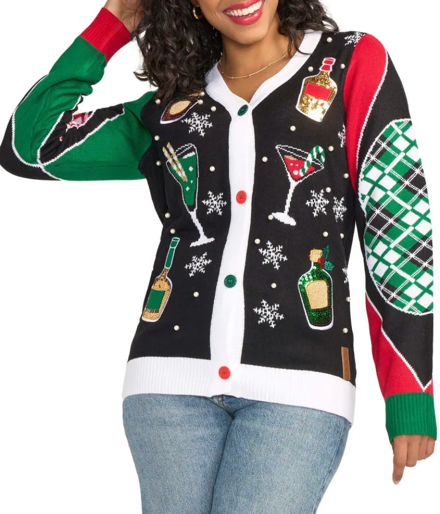What’s a Christmas without a little mixing? Not a very merry one, to be honest. When we say we’re in the Christmas spirit, the highest of those is due to another kind of spirit altogether – and mixed together with the right holiday pairings. Whether it’s a warm spiked cider or mulled wine, raise your glasses and holiday garnish to make for a merry evening in the Women’s Mix and Be Merry Christmas Cardigan Sweater!