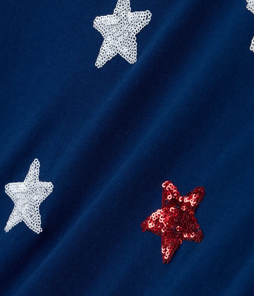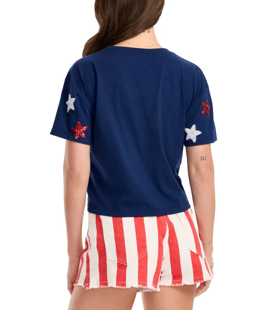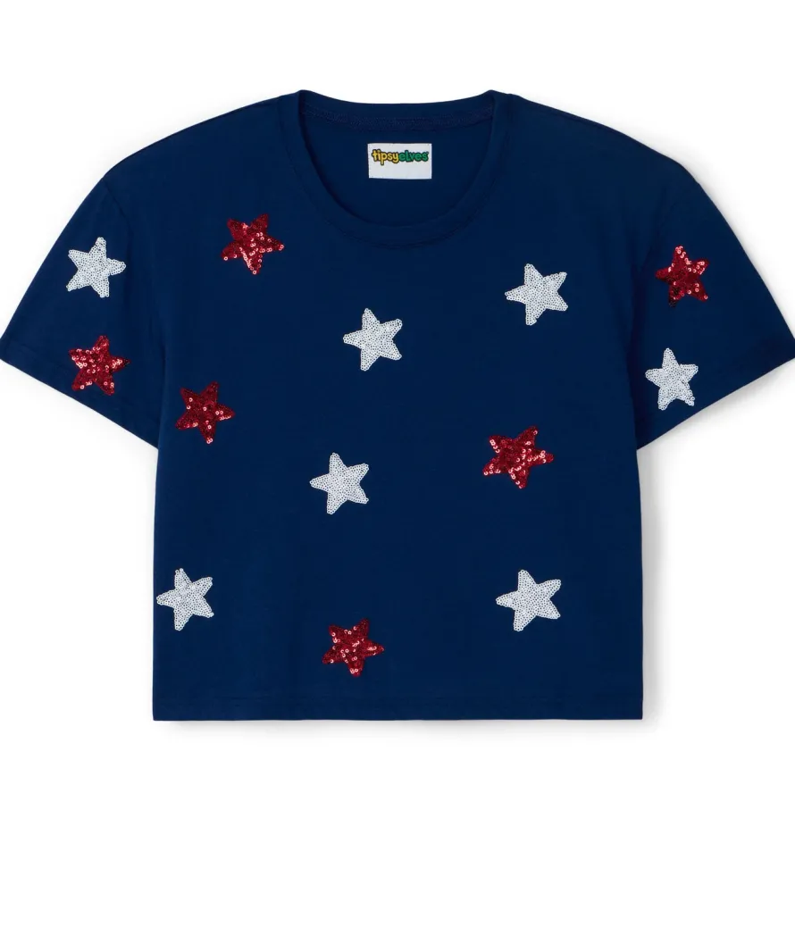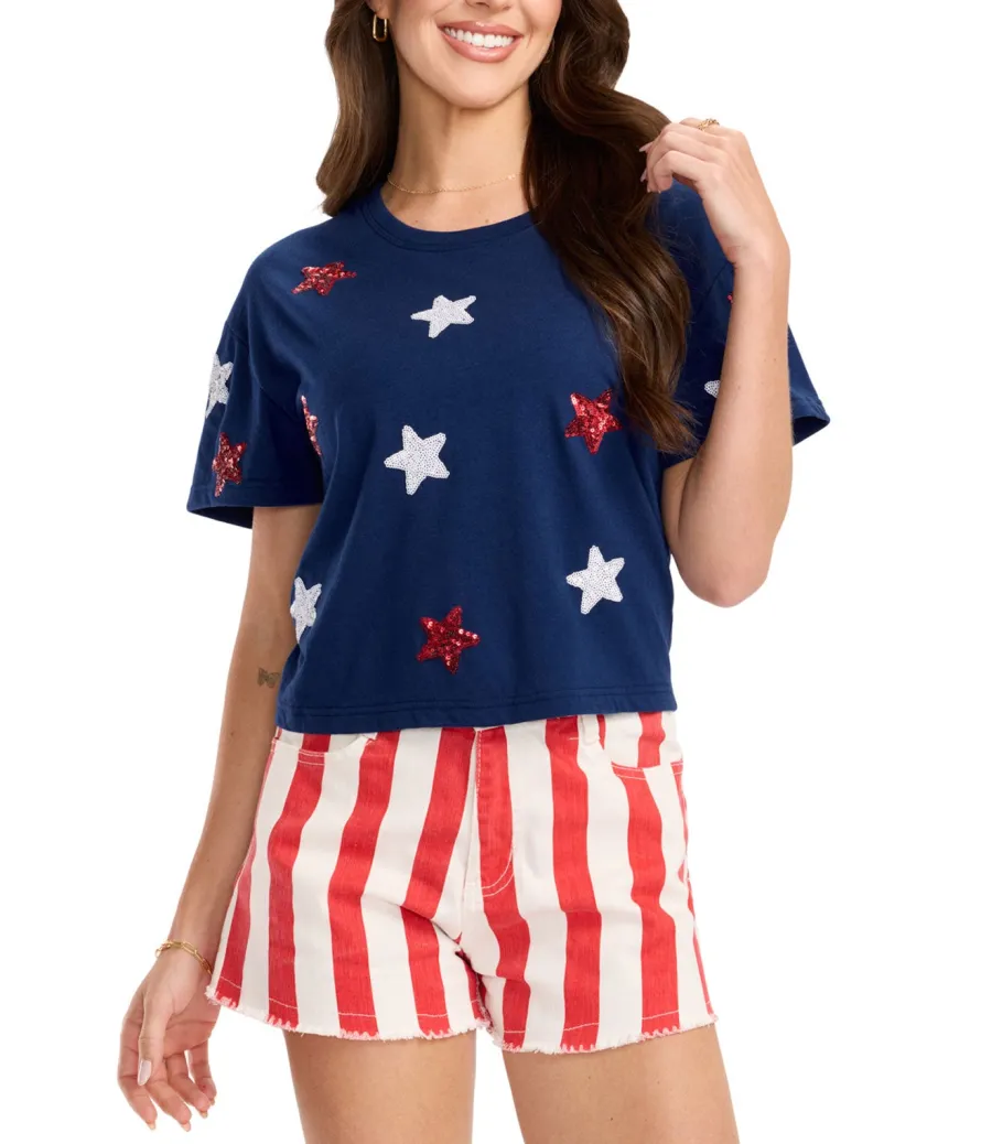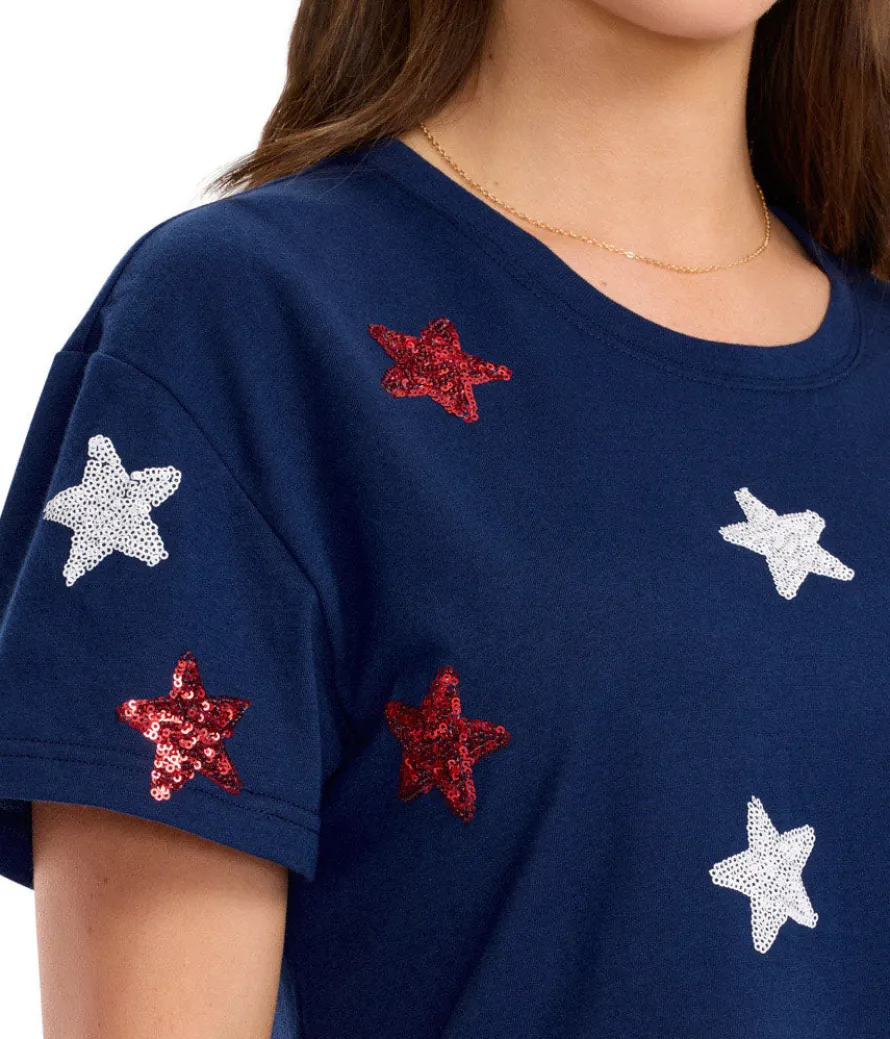 Star-spangled and sparkling, this Women’s Navy Stars of Summer Sequin Cropped Tee is the fireworks finale of your wardrobe. The navy and sequins come together to pop like it’s the Fourth of July every day. With a flattering crop and breathable fabric, it’s your go-to for everything from beach days to boat parties. Equal parts comfy and celebratory, this tee brings the heat—and the shimmer. Shine bright, party harder.