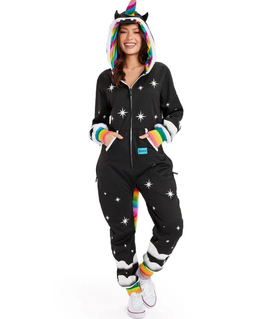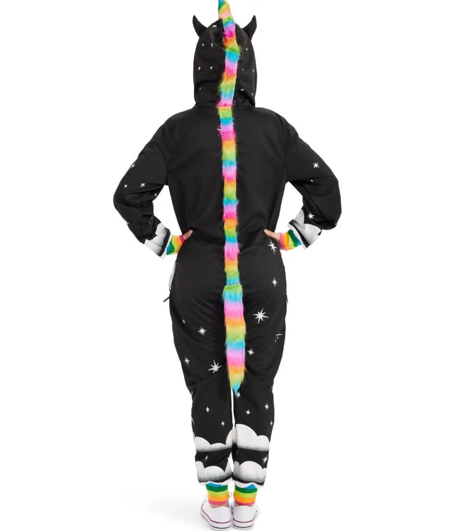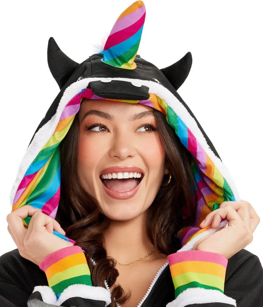 If there’s one time of the year you can indulge your nerdy fantasies, Halloween is it. Why don a chainsaw and hockey mask when you can literally eat rainbows? Our women’s black unicorn costume is everything you could want from a Halloween outfit. Dark and mysterious? Check. Colorful and fantastical? Check. Warm and comfortable? Bonus! There’s no awkward sweating or bathroom break nightmare with this unicorn costume. Just breezy living and epic dance moves. Much like being a unicorn, we’d guess. The rainbow-colored horn and tail are the cherry on top of this super cute costume. Once Halloween is over, hang with your gal pals at a pajama party or snuggle into it when you’ve got a case of the Mondays. There’s even a convenient zip to shut yourself away from the world and dive into Unicorn Land. All the horseplay with none of the hay – sign us up!