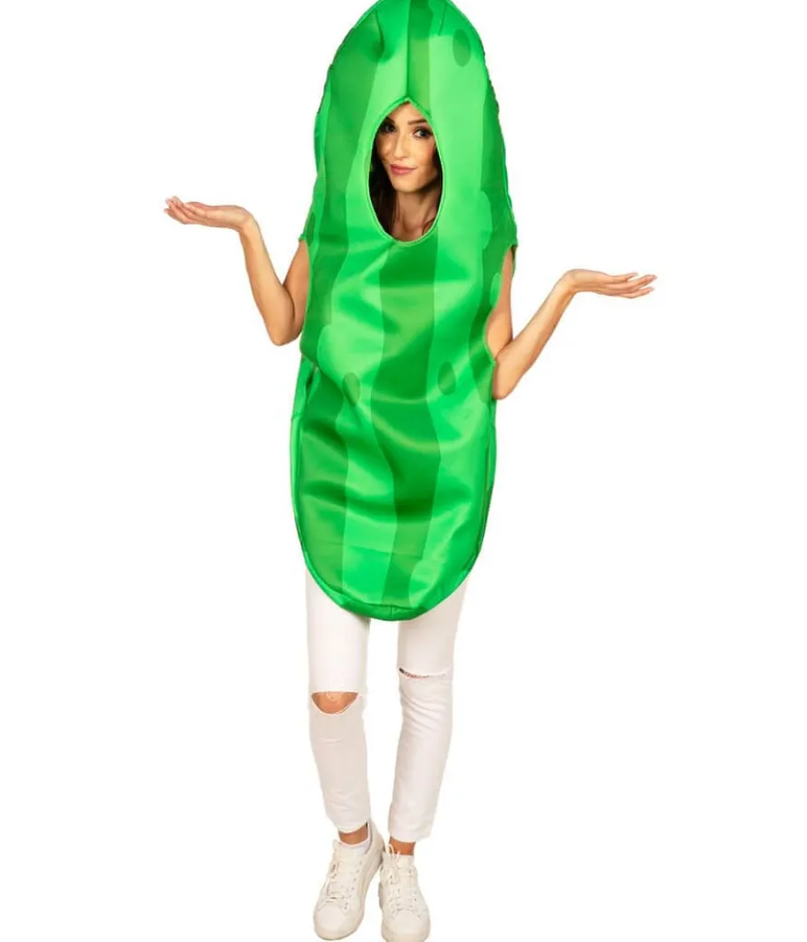 Getting into a bit of a pickle with your costume searching? Ya, us too. That’s why we’ve used this as our latest costume inspiration. Our Women’s Pickle Costume is the party guest nobody asked for – just like those pickles in your hamburger. Here’s the key difference: you can actually convince people to let you stay. With this all green one-piece, you’ll look the part: all you have to do is add your own signature slice of tang. The easy one-piece design invites you to accessorize as you please! Does your pickle need a hamburger costume? Or do you just want to make it easy and team it with some crazy pants? Wrap up warm or go risque. We guarantee you’ll be the only pickle at the party. Heck, we’ll go out on a limb – you’ll probably be the only vegetable there. Relish in the fun – and we’ll be here all week.