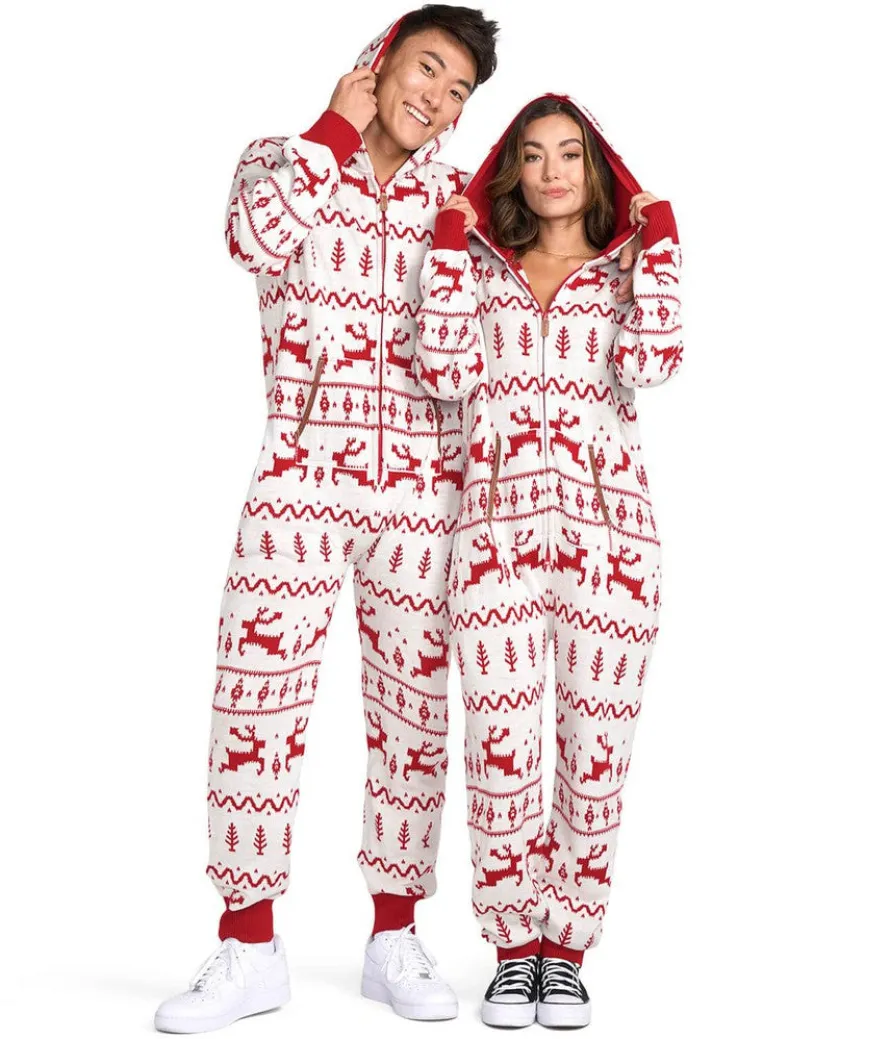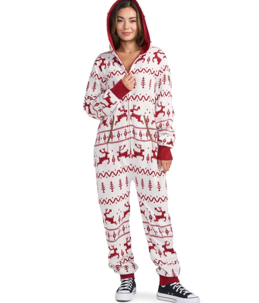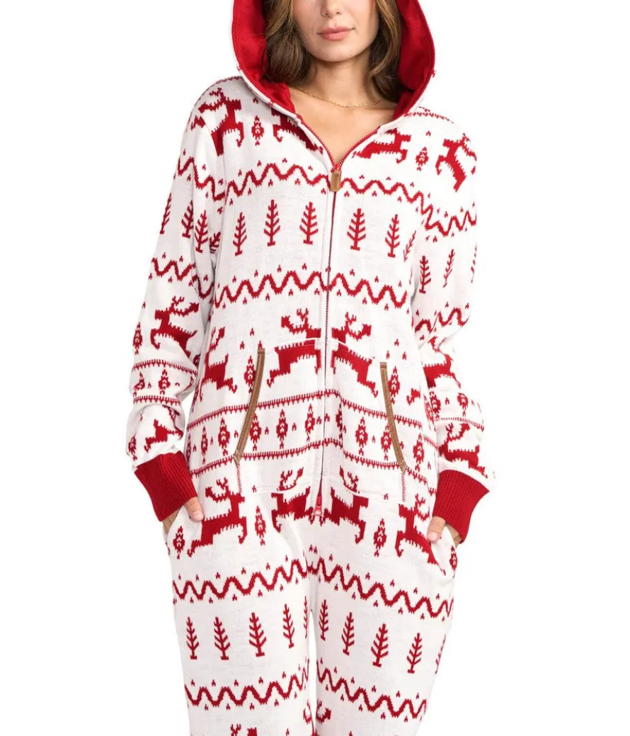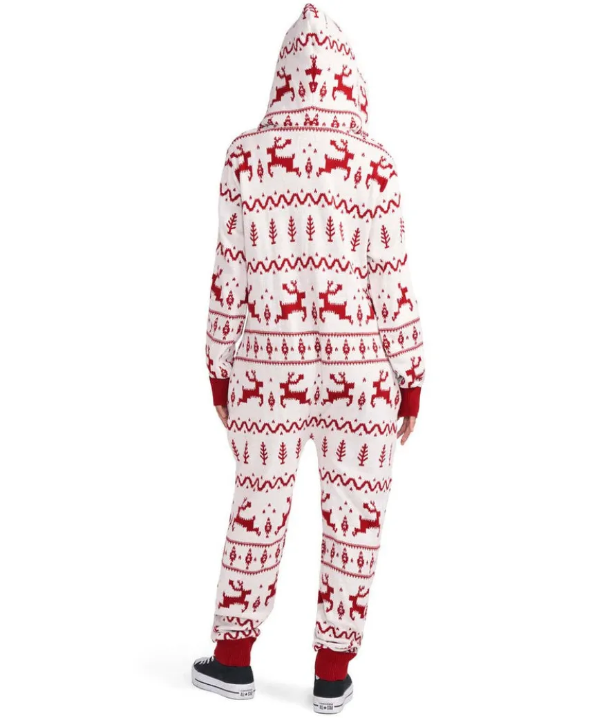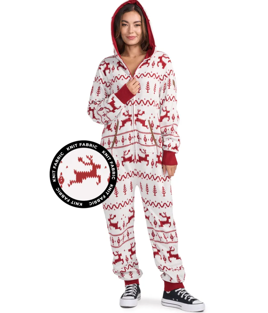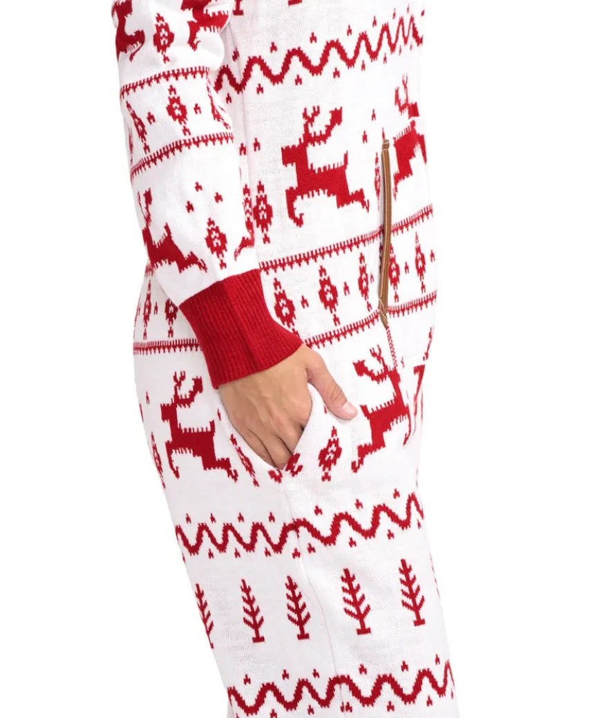 Reminiscent of a winter wonderland, the Women’s Red and White Fair Isle Knit Jumpsuit gives the feelings of a light snow day by the fire. The red, classic Christmas prints give that feeling of warmth against the white jumpsuit. All your Christmas cheer? It’s right here.