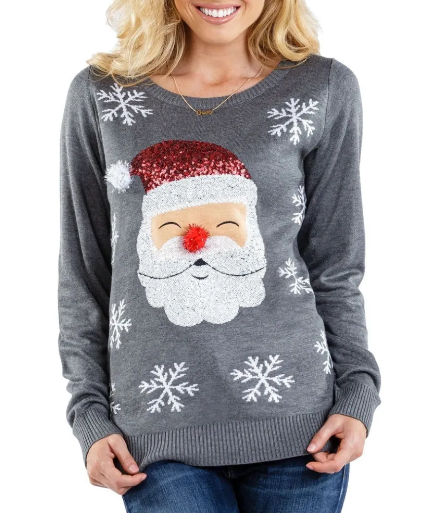 Not feeling the love this Christmas? Throw this on and watch people line up to give you a hug or sit on your knee. Our Women’s Red Nose Santa ugly Christmas sweater has the cutest sequin design of Santa Claus, it would even make Ebenezer Scrooge smile. This year, Rudolph’s got a night off. Santa’s rocking his sweetest red nose, or maybe just a cold. It’s hard to say. Naturally, he’s the happiest dude in the world, but this time around, it’s you who’s making him smile as he nestles into your bosom. Rock those snowflakes and watch the presents pile up.