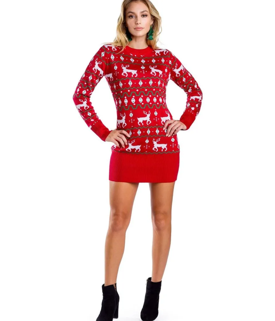 Want some awesome Fair Isle knit fashion that sets you apart from the crowd on a gray winter day? Women’s red reindeer sweater dress is just the ticket. It fits like a mitten (or a nice knit glove) and gives you plenty of options to dress it up with accessories and heels or go casual with leggings and boots.