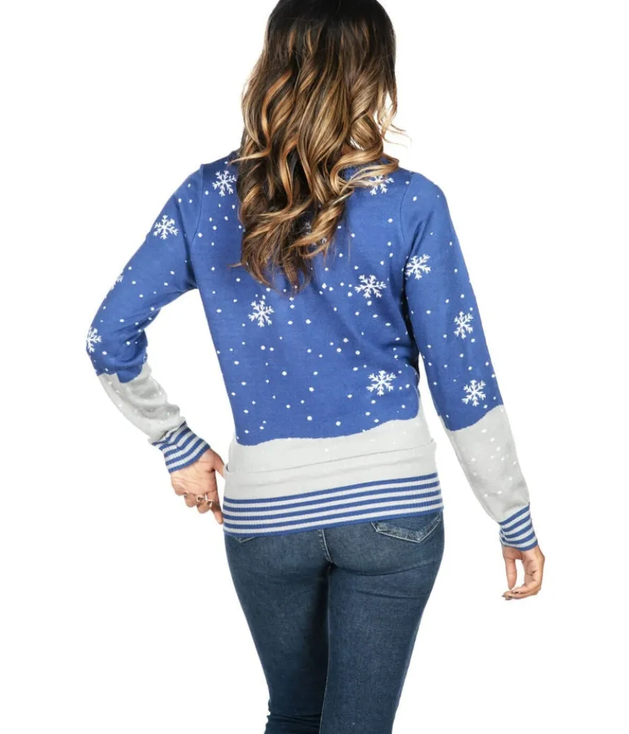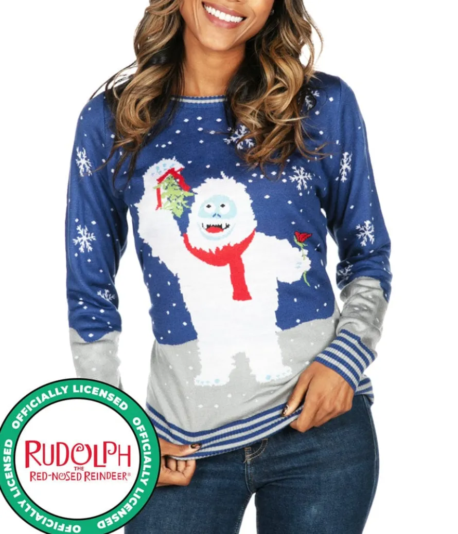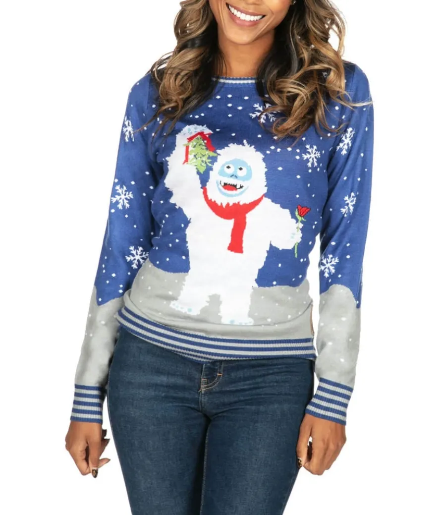 Remember Bumble? The abominable adorable snowman from the beloved Rudolph the Red-Nosed Reindeer Christmas special from years ago? Well, he’s back, and he’s ready to help you woo your bae. This Women’s Bumble Bae ugly Christmas sweater has him dressed in his best holiday scarf and holding a rose in one hand and mistletoe in the other. It’s just what you need to help your tidings of good cheer land with your significant other.